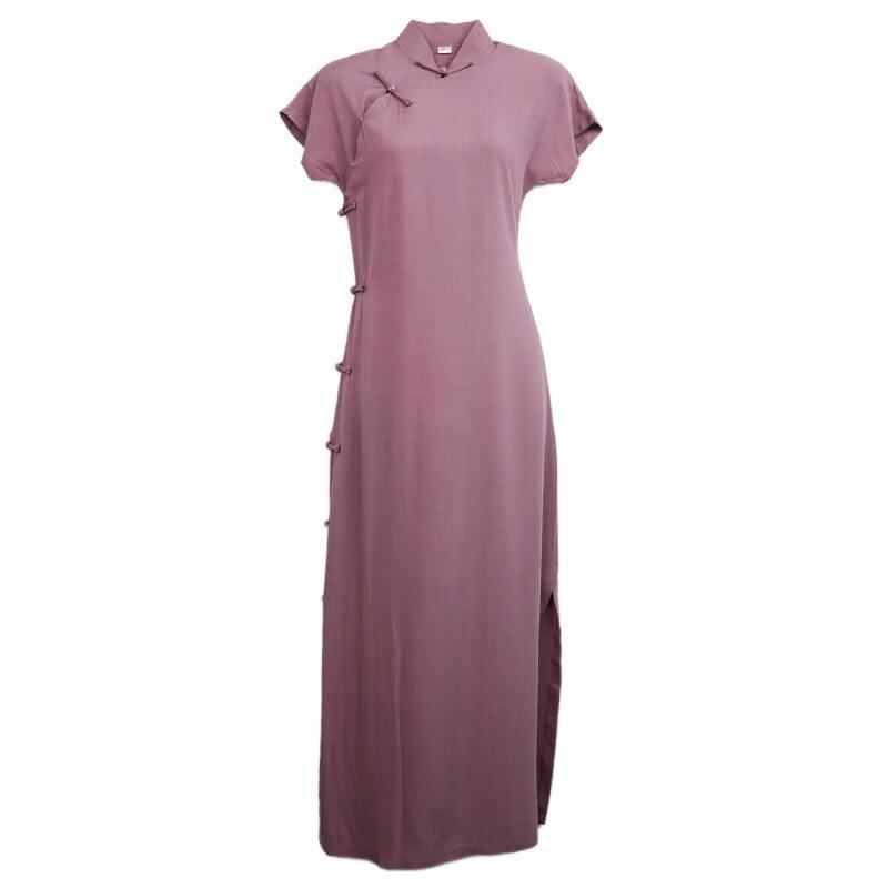 チャイナドレス レディース パープル レトロ クラシック 新中国風 春夏 ロング丈 低スリット 前開き 改良型 普段使い スタンドカラー 斜め襟 3分袖 レーヨン素材