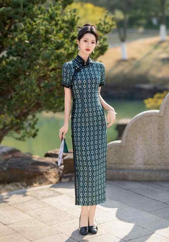 チャイナドレス レディース ミセス ロング丈 春夏 普段使い レトロ モダン 上品 エレガント スリムフィット 着痩せ効果 スタンドカラー 斜め襟 半袖 スリット入り 伸縮性 ポリエステル