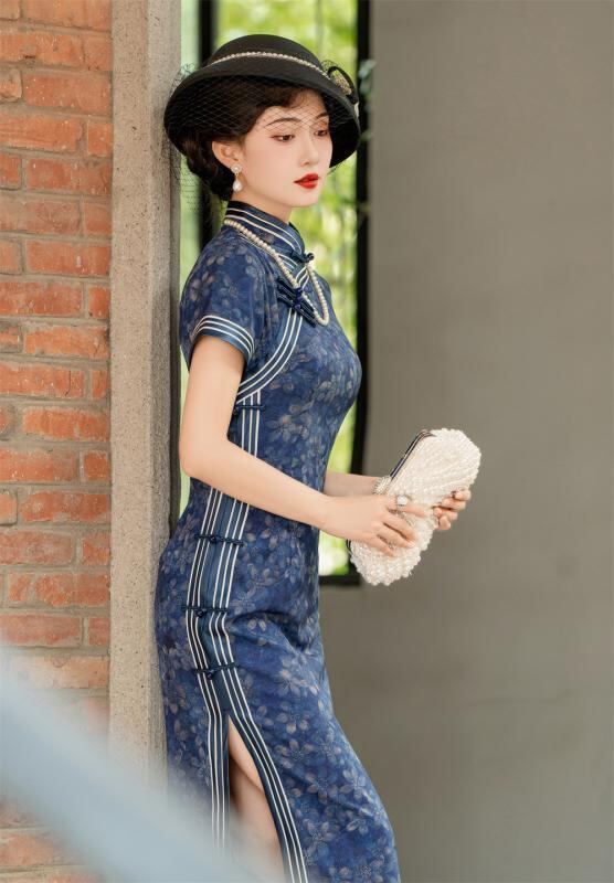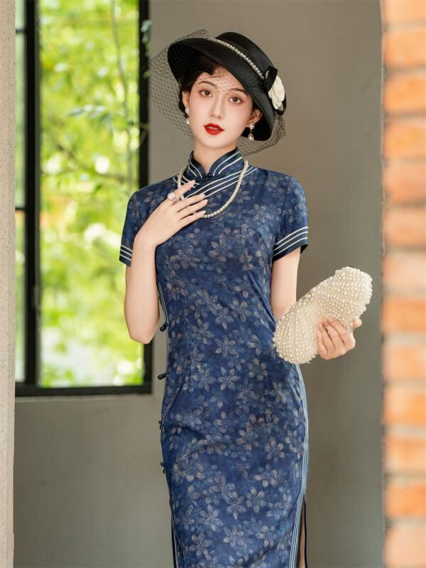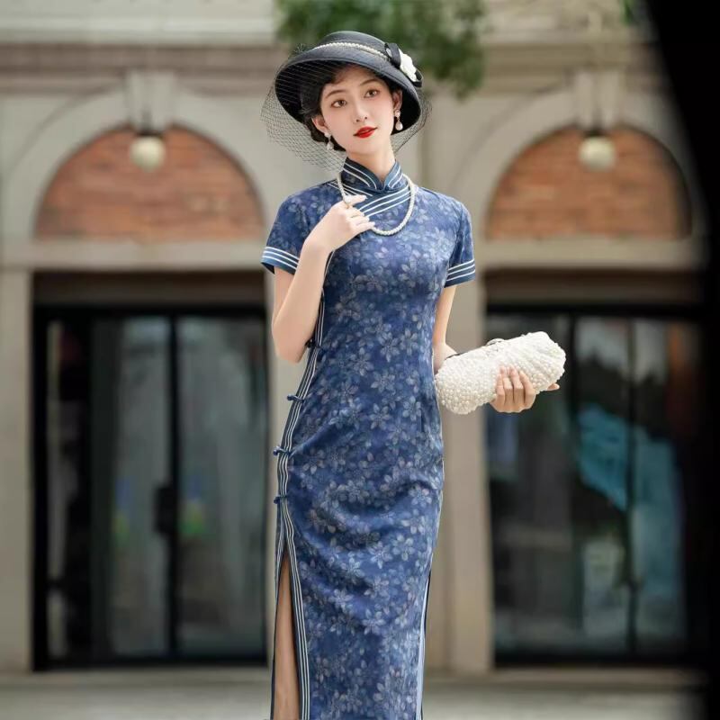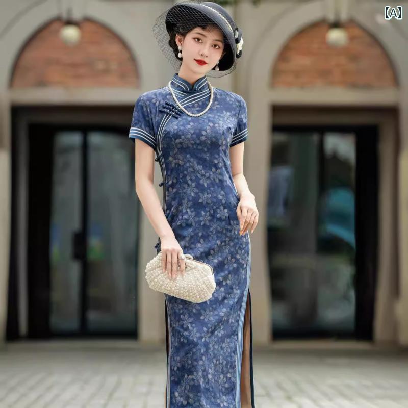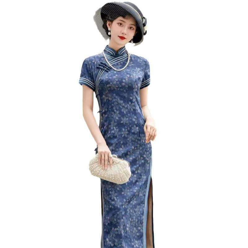 チャイナドレス レディース 高級感 新中華風 改良 上海風 エレガント ロング丈 春夏 普段使い 伸縮性 綾羅緞 スタンドカラー 斜め合わせ 五分袖 立体柄