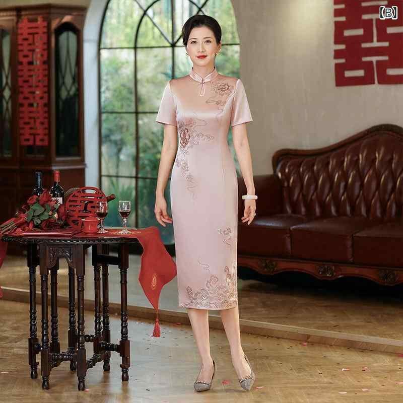 チャイナドレス レディース 母親向け フォーマルドレス 婚約式 結婚式 披露宴 アセテート生地 半袖 刺繍 ミディ丈 ハイネック 高級感 春夏