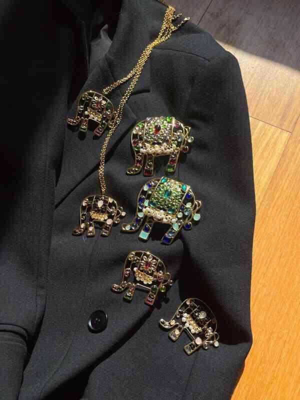 ブローチ レディース ゾウ ガラス イタリア ハンドメイド ヴィンテージ レトロ カラフル 黒ピンク 電気メッキ加工 高級感 コート ジャケット ドレス ファッション 小物 おしゃれ