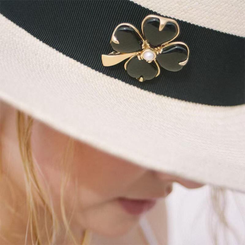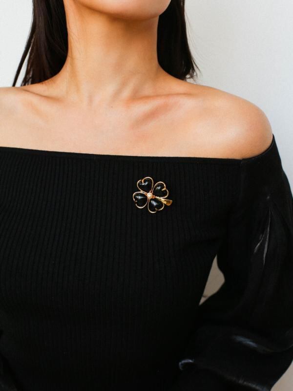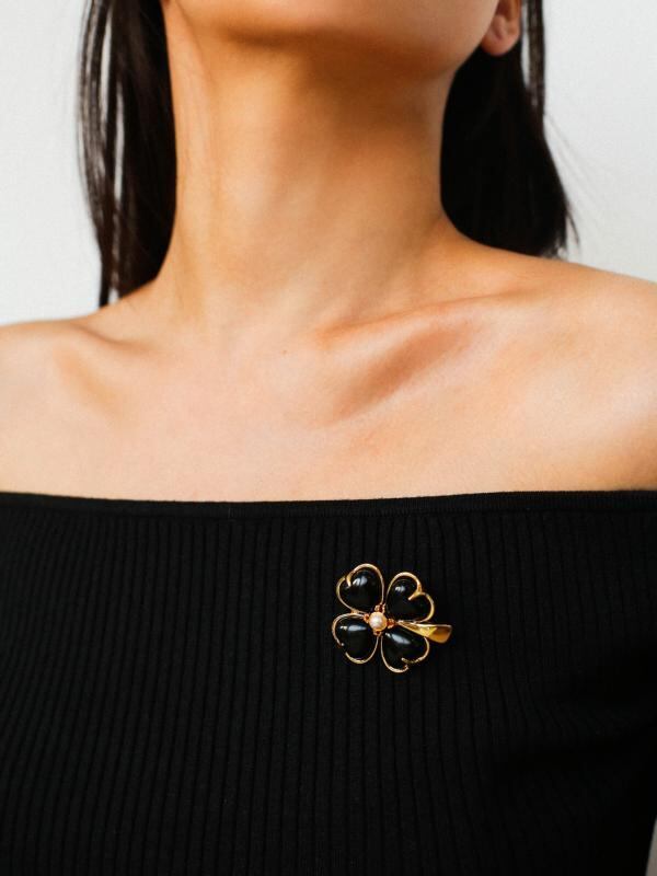 ブローチ 男女兼用 クローバー モチーフ ホワイトクリスタル 黒瑪瑙 上品 エレガント 高見え おしゃれ 普段使い フォーマル 銅製