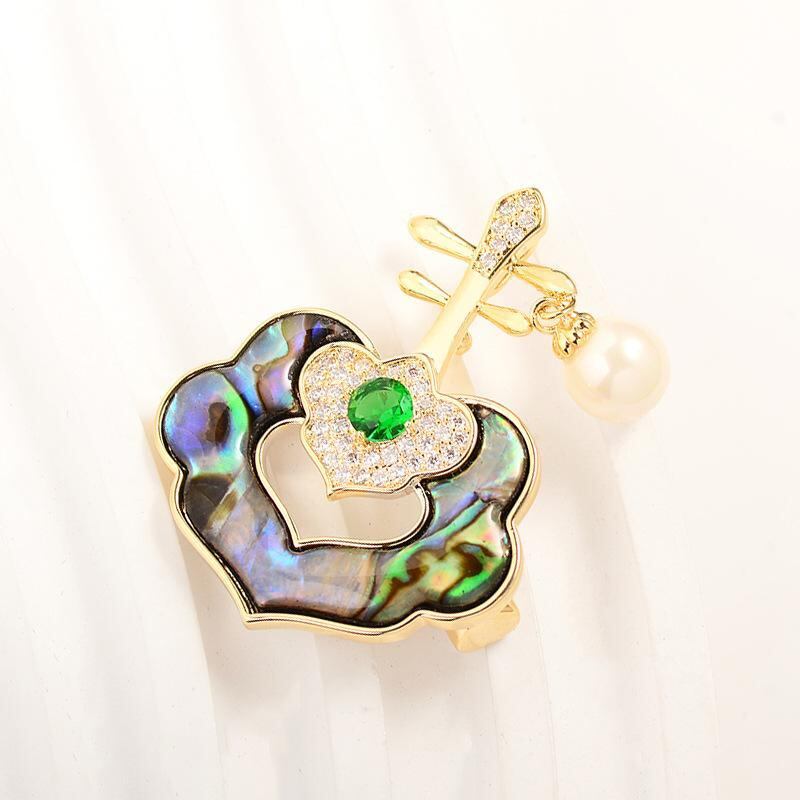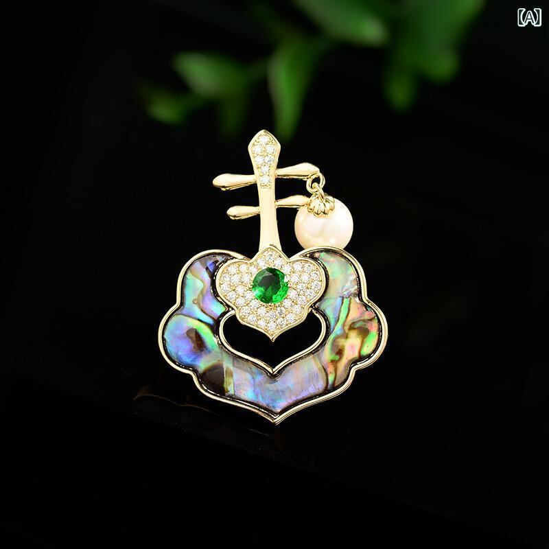 ブローチ レディース 女性用 琵琶型 貝殻 ジルコニア 銅製 電気メッキ加工 高級感 精巧 クラシック エレガント レトロモダン 個性的 アジアンテイスト アクセサリー フォーマル 普段使い プレゼント