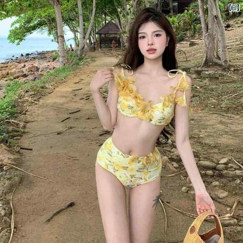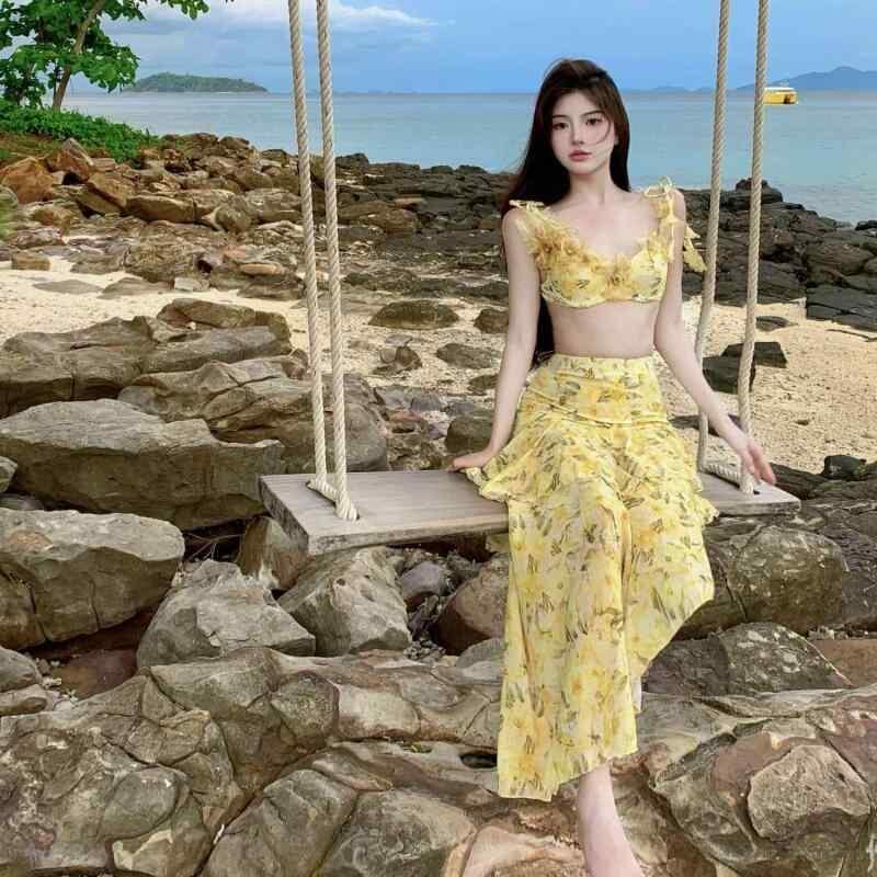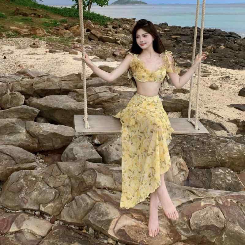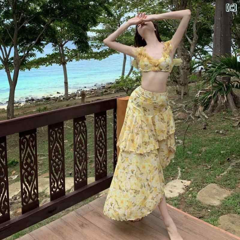 水着 レディース セパレート ビキニ 3点セット マキシスカート 背中開き セクシー 高級感 ワイヤー入り パッド付き ポリエステル 高伸縮性 リゾート バカンス 旅行 ビーチ プール 春夏 小花柄 イエロー