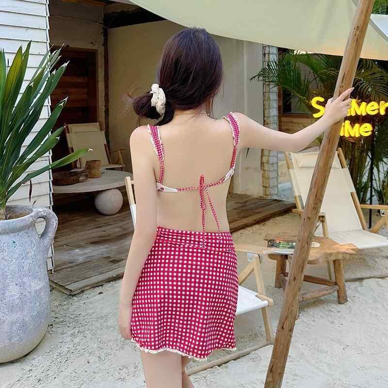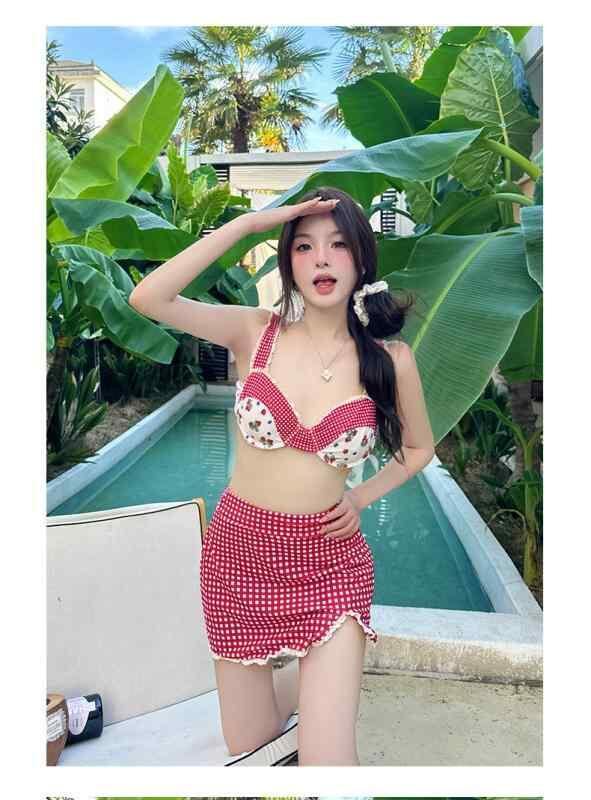 ビキニ レディース 3点セット セパレート 水着 いちごチェック柄 かわいい ガーリー レース ハイウエスト ワイヤー入り パッド付き ポリエステル 春夏 リゾート プール 海 ビーチ