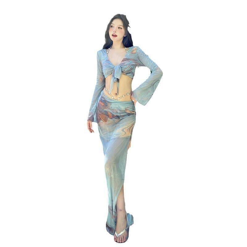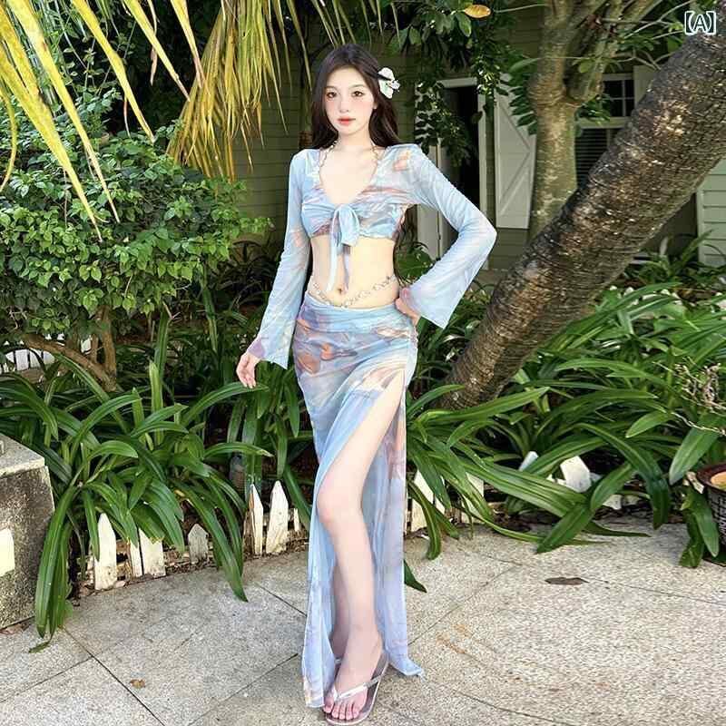 水着 スイムウェア レディース プリント タイダイ 高級感 セクシー セパレート ビキニ 春夏 4点セット 長袖 カバーアップ スリット ロングスカート ワイヤー入り ブルー ナイロン スパンデックス ポリエステル