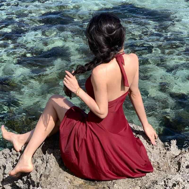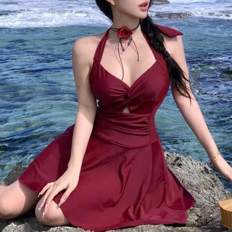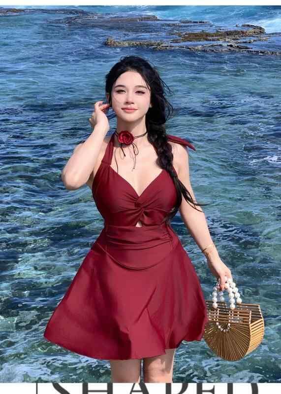 水着 レディース ワンピース レトロ 無地 スカート一体型 長袖 体型カバー 着痩せ効果 大きいサイズ ゆったり 高伸縮性 耐久性 ポリエステル 春夏 スイムウェア プール ビーチ