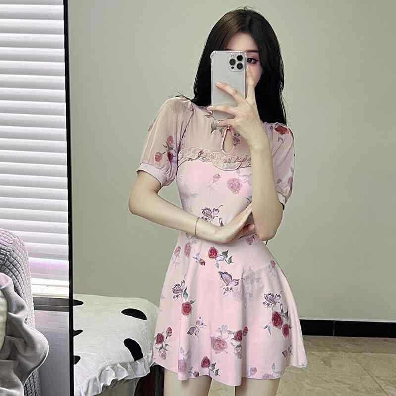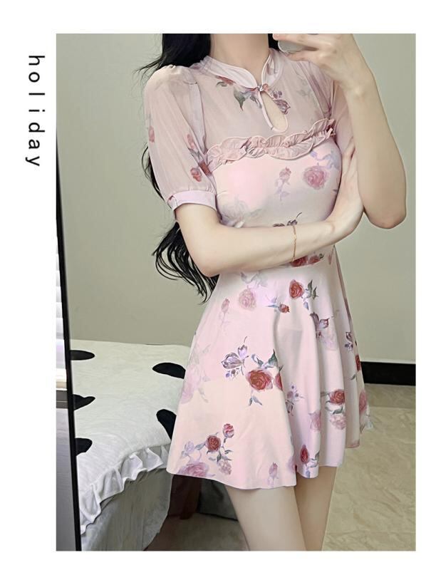 ワンピース水着 レディース チャイナ風 体型カバー 半袖 レース ワイヤー入り バストアップ効果 パッドなし ピンク プリント柄 温泉 リゾート 旅行 ママ水着 高級感