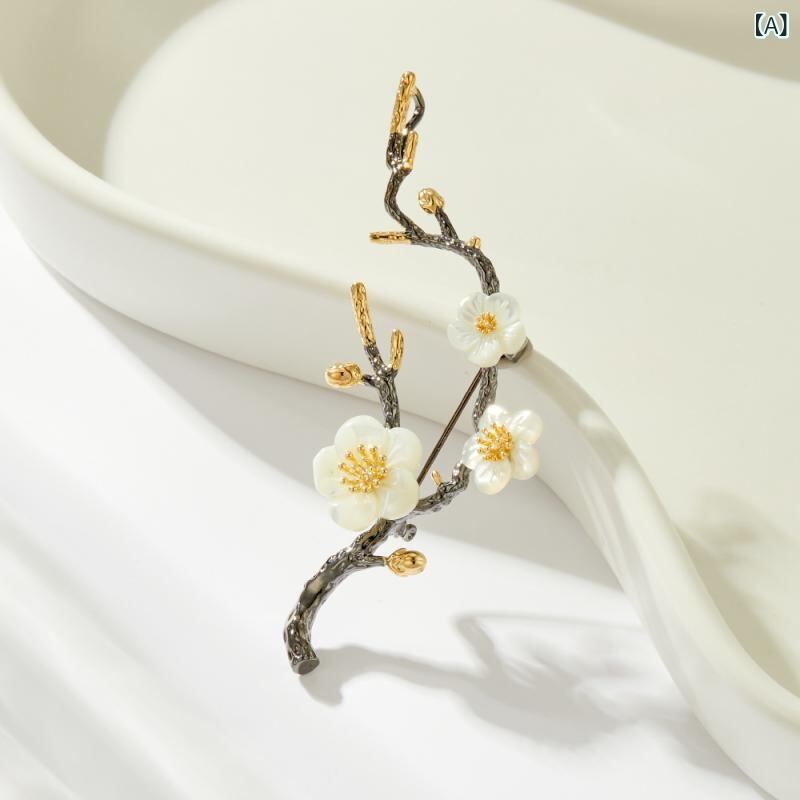 ブローチ レディース ファッション ライトラグジュアリー バイカラー ゴールド 梅の花 シェルモチーフ レトロ エレガント 高級感 銅製 電気メッキ加工 アクセサリー