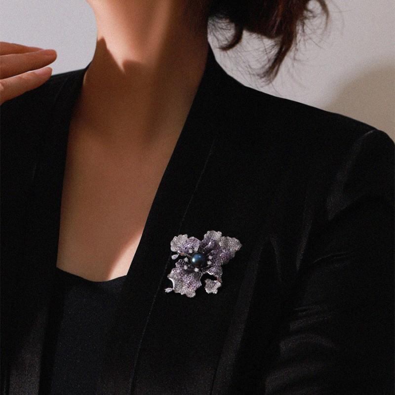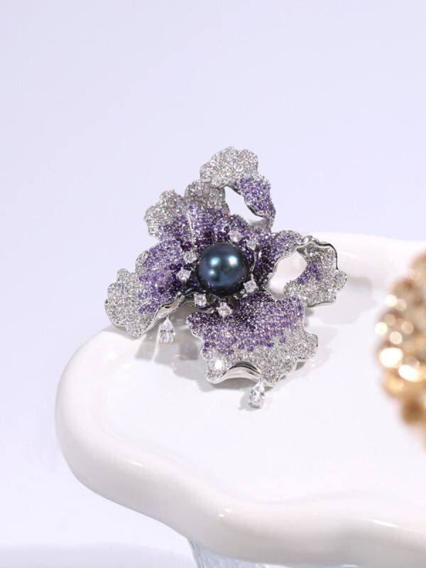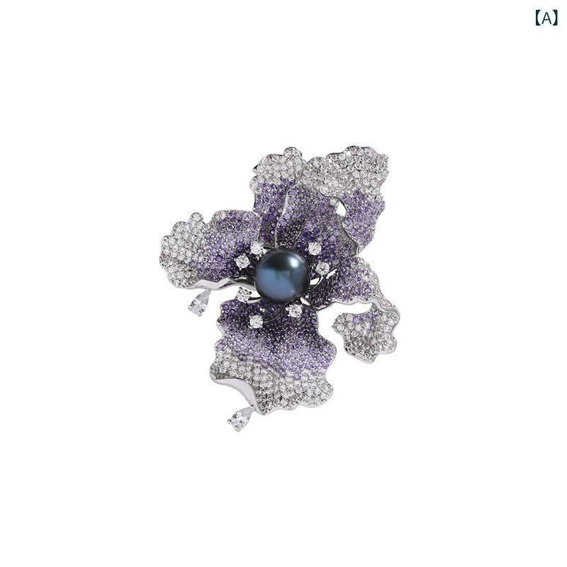 ブローチ 男女兼用 高級感 エレガント 牡丹 フラワー パープル グラデーション 淡水パール ジルコニア 秋冬 コート スーツ用 アクセサリー 上品 きらめく