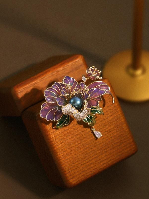 ブローチ 男女兼用 牡丹 グラデーション エナメル彩 パール装飾 高級感 繊細 オシャレ エレガント オリエンタルデザイン 春夏 通勤スタイル パーティー 結婚式 フォーマル
