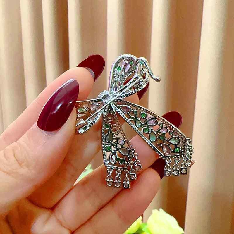 ブローチ レディース 韓国風 上品 繊細 透かし彫り リボン 揺れる カラフル 銅製 電気メッキ加工 スーツ ジャケット フォーマル 結婚式 卒入学式 胸元アクセサリー