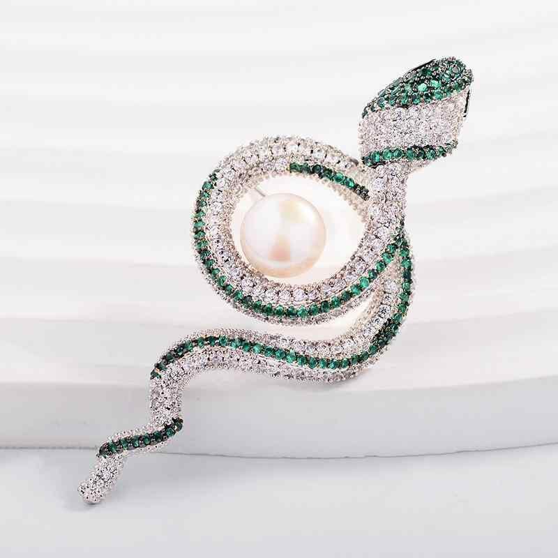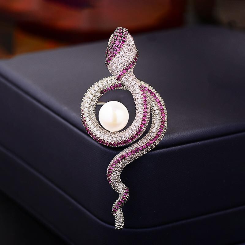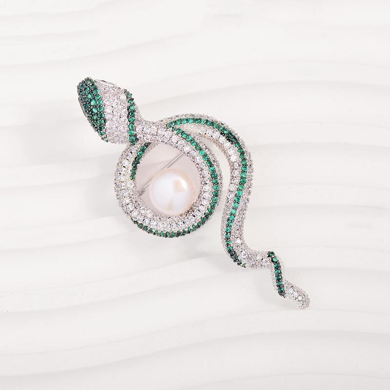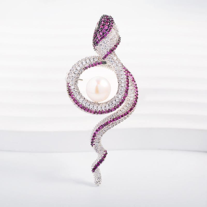 ブローチ レディース 蛇モチーフ アニマル 淡水パール パール ジルコニア 高級感 上品 個性的 エレガント 銅製 電気メッキ加工 レッド グリーン 秋冬