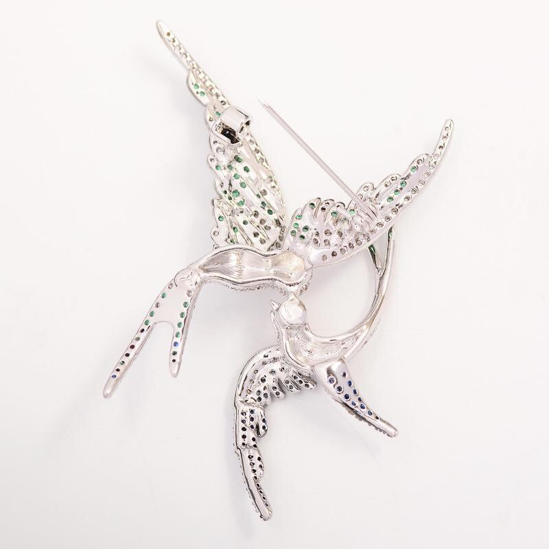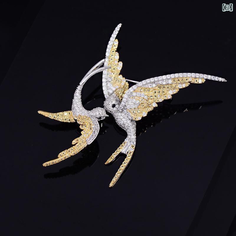 ブローチ レディース 女性用 燕モチーフ 個性的デザイン 上品 エレガント ジルコニア 銅製 電気メッキ加工 スーツ ドレス フォーマル パーティー 結婚式 普段使い シルバー ゴールド