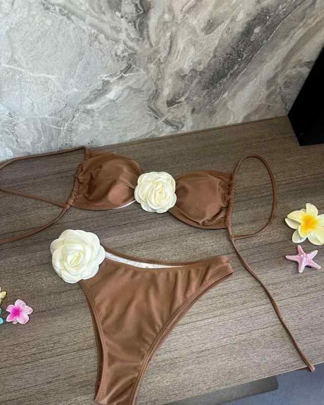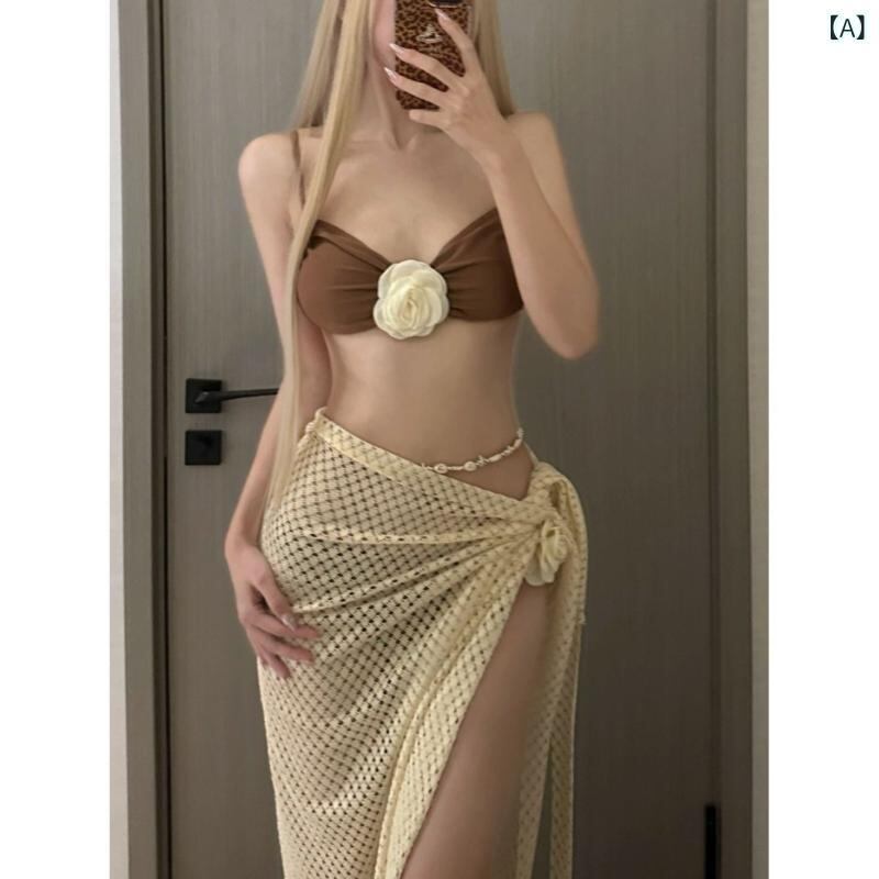 水着 レディース セパレート ビキニ 3点セット 体型カバー 細見え 着痩せ セクシー リゾート 温泉 プール 旅行 ナイロン 速乾 伸縮性 ノンワイヤー 花柄 ベージュ系