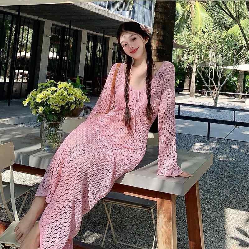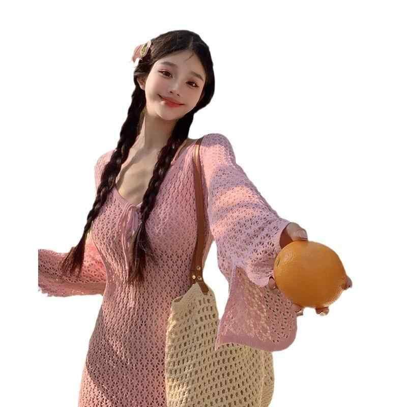 水着 レディース セパレート ビキニ 長袖 カバーアップ ニット ロングスカート ピンク 高級感 温泉 リゾート ビーチ ナイロン 速乾 高弾性 カップ付き ノンワイヤー