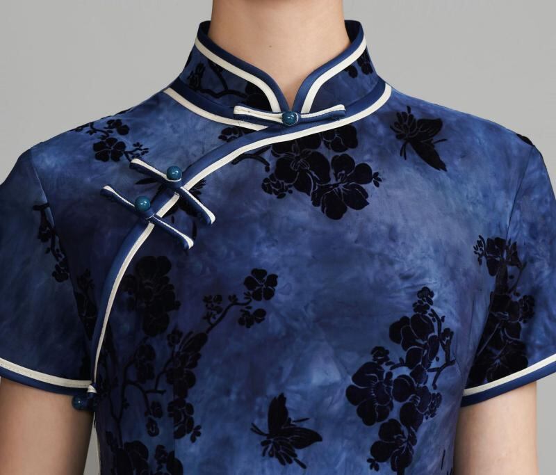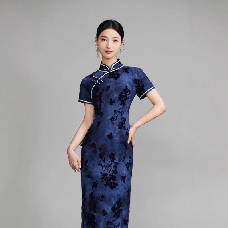 チャイナドレス レディース 女性用 ロング丈 再生繊維 ジャガード織り スタンドカラー ハイネック 五分袖 スリット入り サイドスリット レトロ クラシック エレガント ネイビー 紺色 春夏