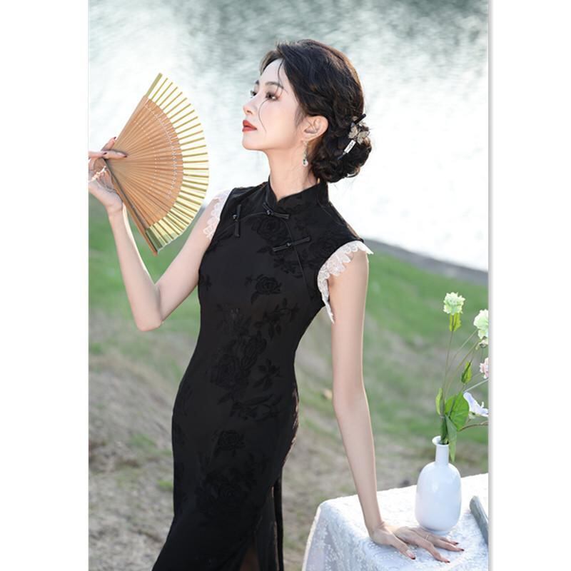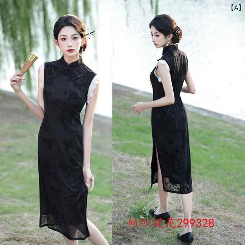 チャイナドレス レディース メッシュ ジャガード織り ミドル丈 ノースリーブ スタンドカラー 改良デザイン 少女風 エレガント 伸縮性 普段使い 春夏