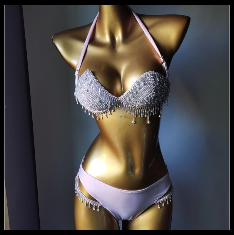 水着 レディース ビキニ ジルコニア フリンジ ビジュー装飾 トライアングル パッド入り ノンワイヤー ナイトプール パーティー ビーチ プール スイムウェア ピンク ゴールド シルバー ブラック