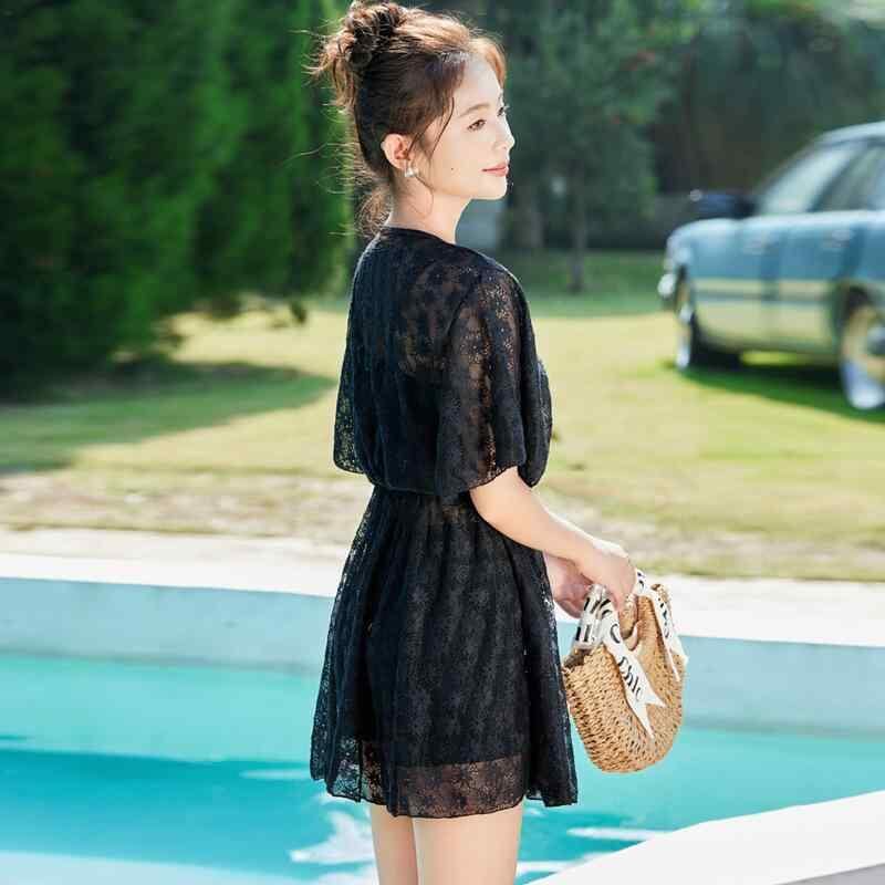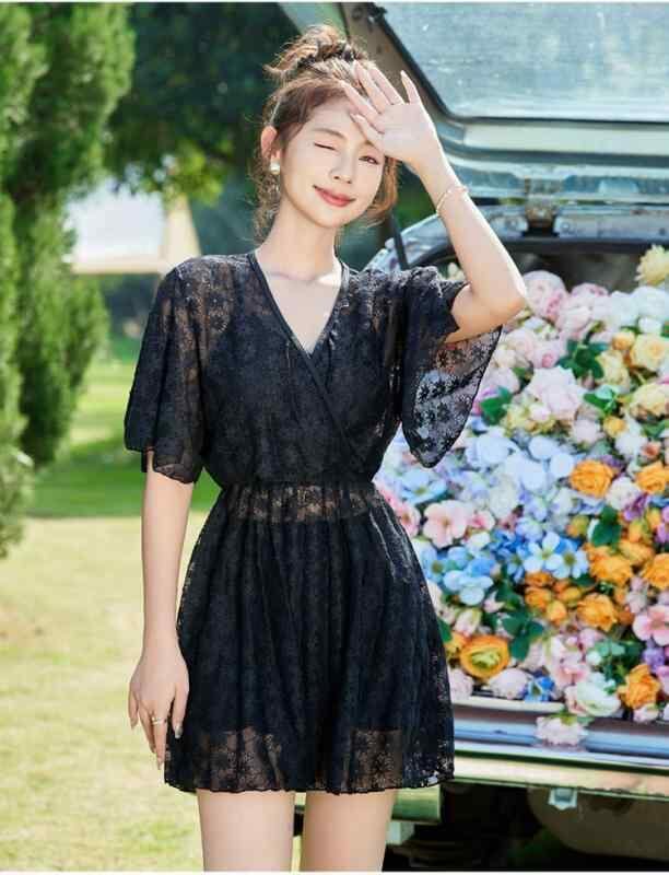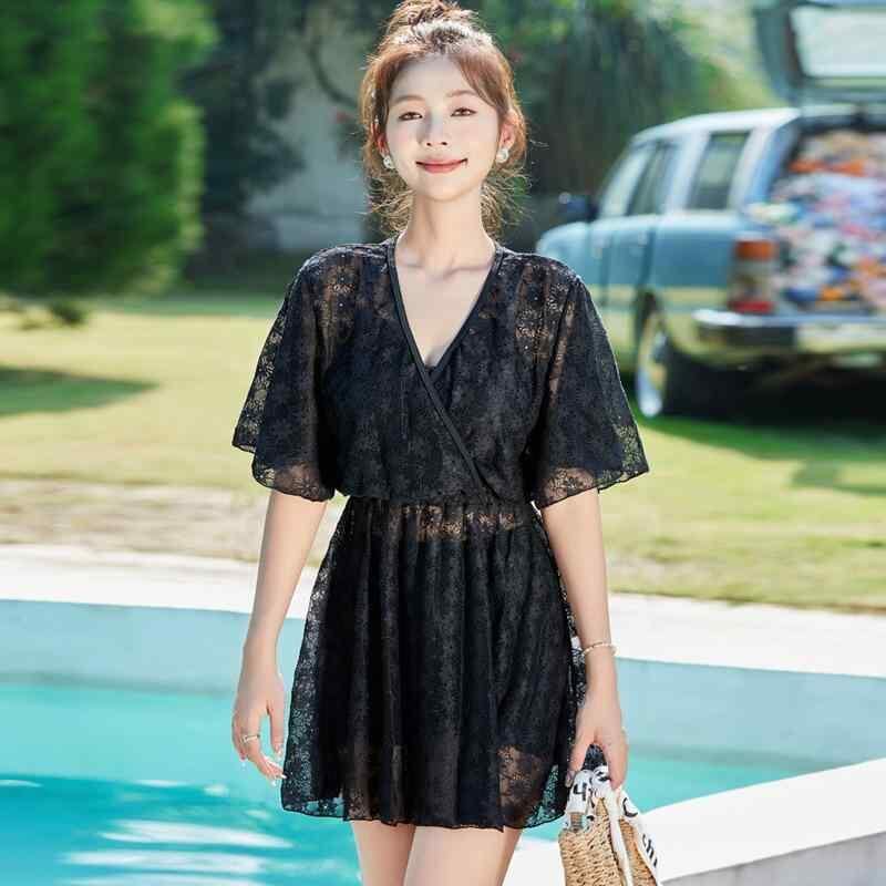水着 レディース フリル 半袖 カバーアップ ワンピース セパレート ボックスショーツ ギャザー 寄せ上げ セクシー 体型カバー 着痩せ ブラック 高伸縮性 耐久性 春夏 プール ビーチ 海水浴