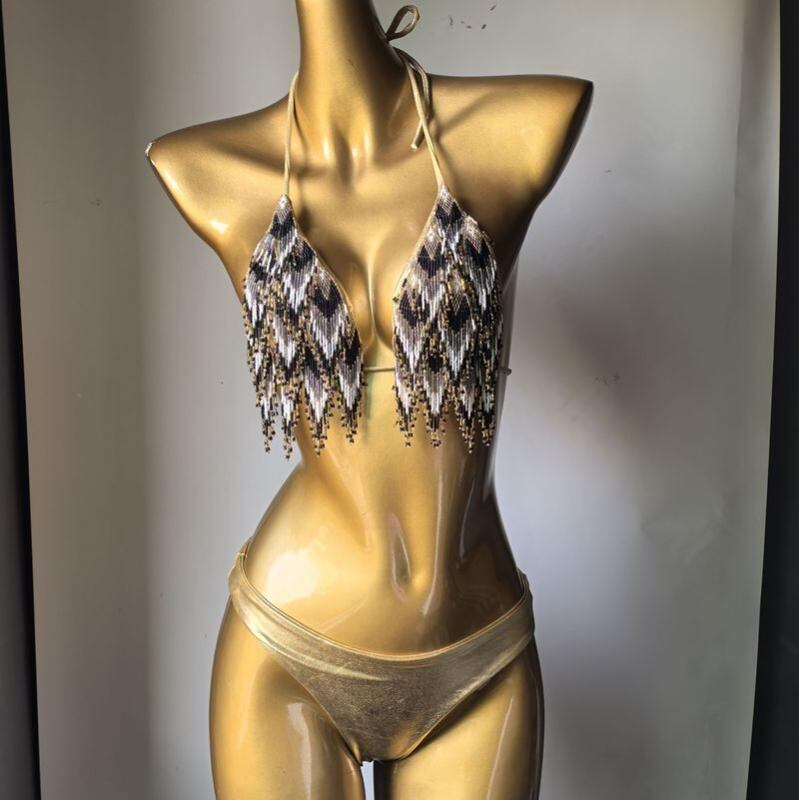 水着 レディース ビキニ ツーピース ワイヤー入り ハードカップ ビジュー フリンジ装飾 ブラック ホワイト ゴールド ピンク シルバー スパンデックス素材 ビーチウェア プール 海水浴 春夏