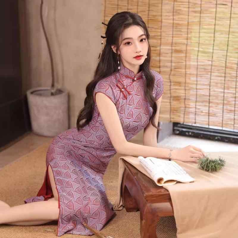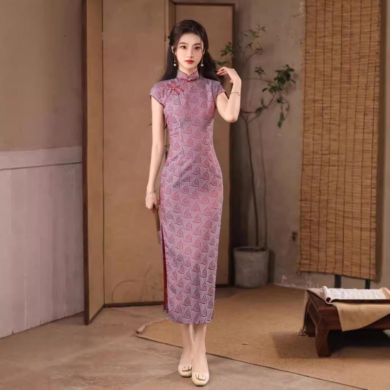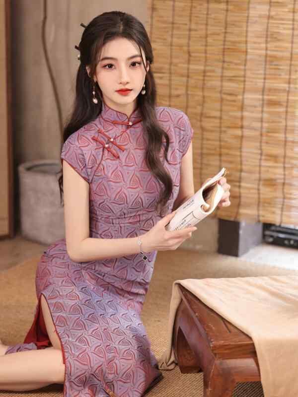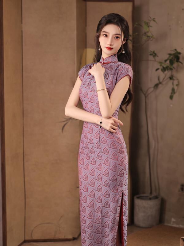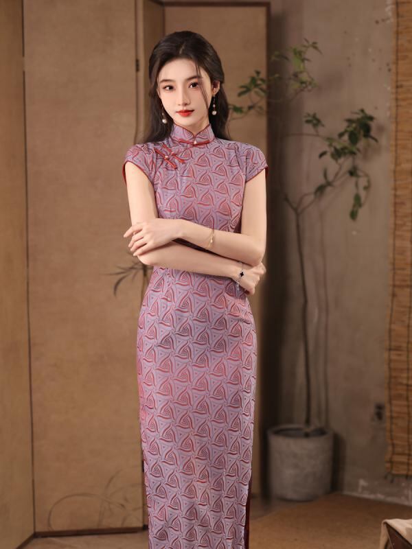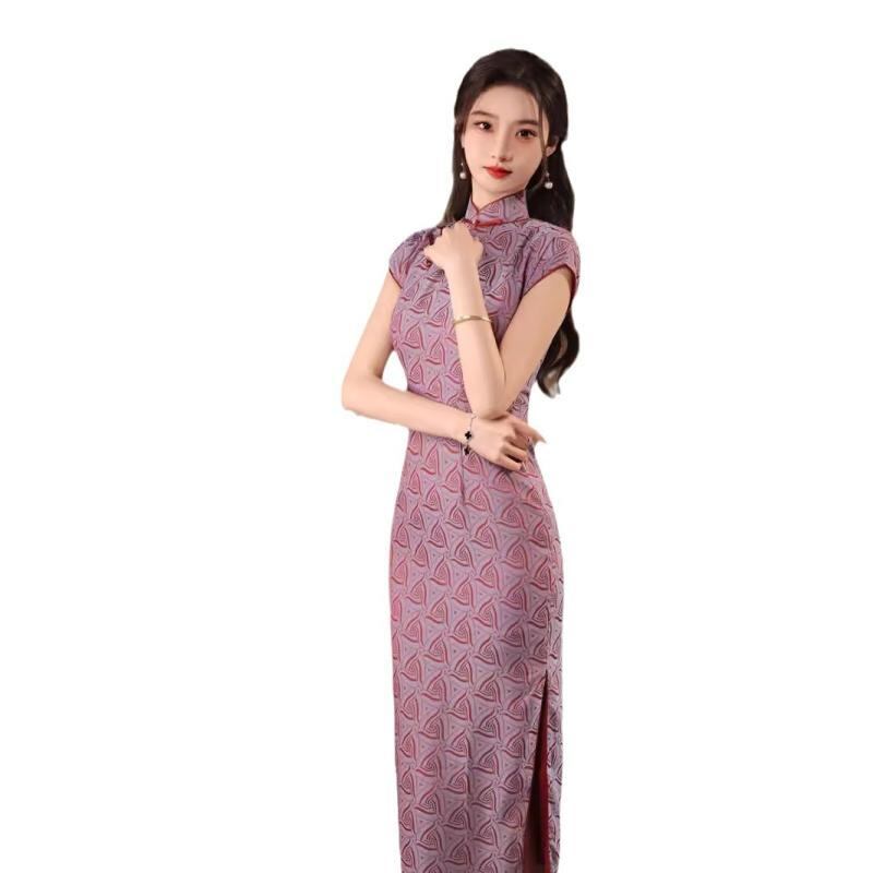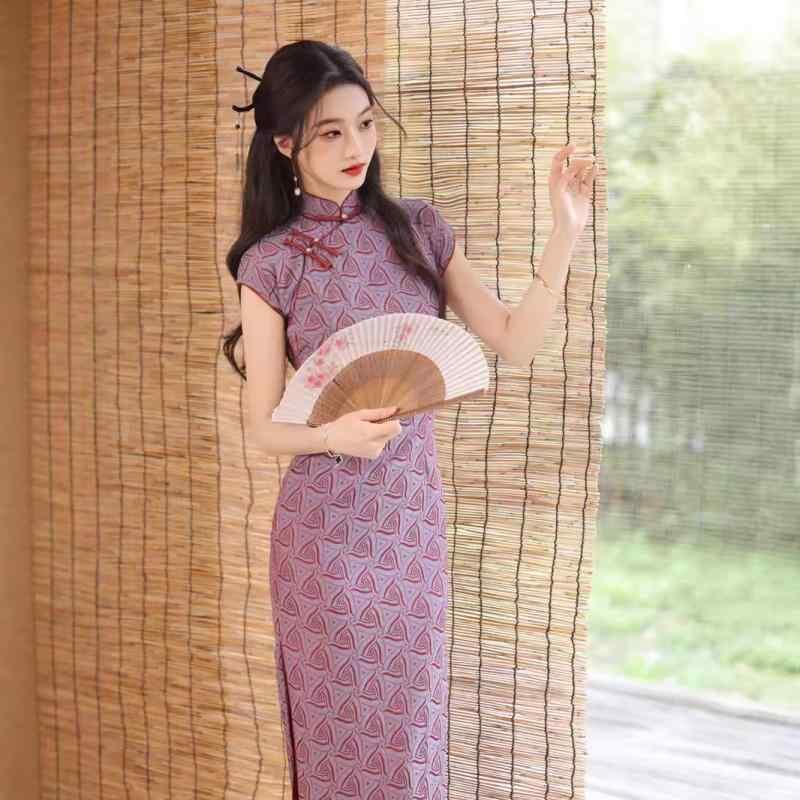 チャイナドレス レディース パープル ジャカード織り レトロ 中華風 半開襟 改良デザイン ノースリーブ ロング丈 配色 ポリエステル スパンデックス素材 伸縮性 スタンドカラー 斜め襟 春夏 ワンピース