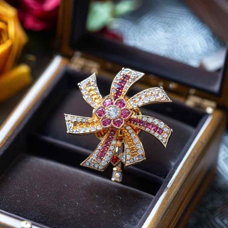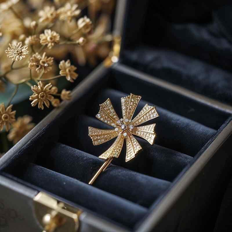 ブローチ レディース 女性用 風車モチーフ 華やか 上質 ジルコニア 煌めき 銅製 電気メッキ加工 オリジナルデザイン 記念 飾り 秋冬