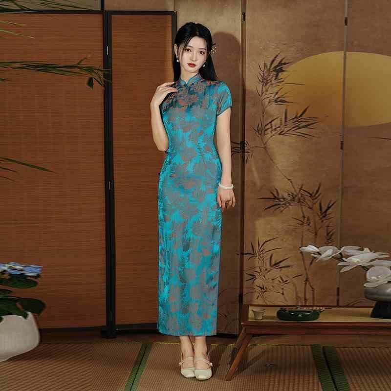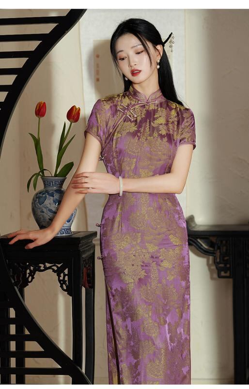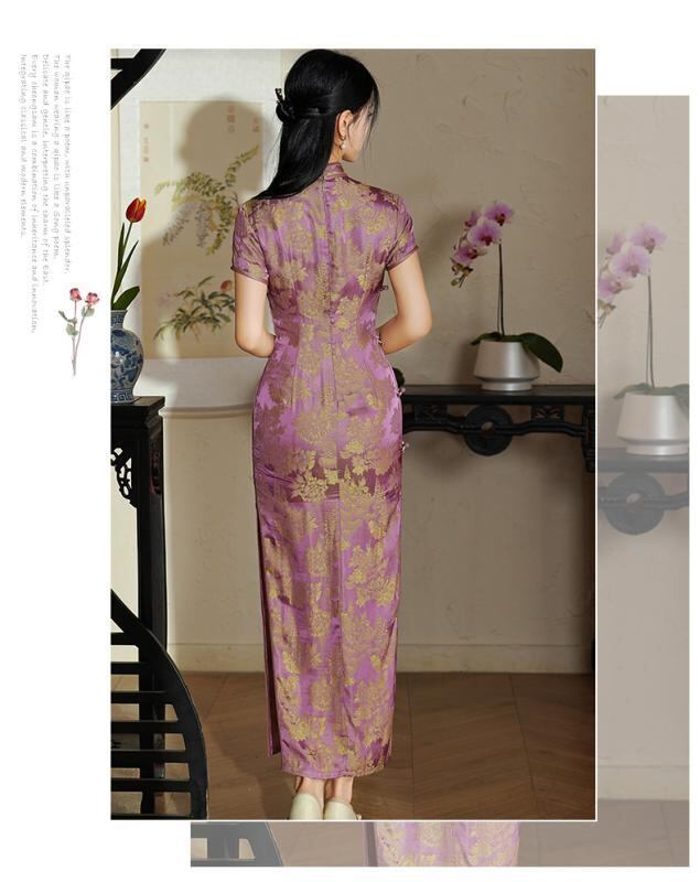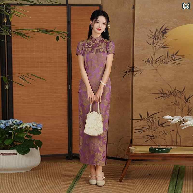 チャイナドレス レディース ワンピース 春夏 パープル ロング丈 大きいサイズ ゆったり エレガント 上品 高級感 ジャガード織り デイリーユース スタンドカラー 五分袖