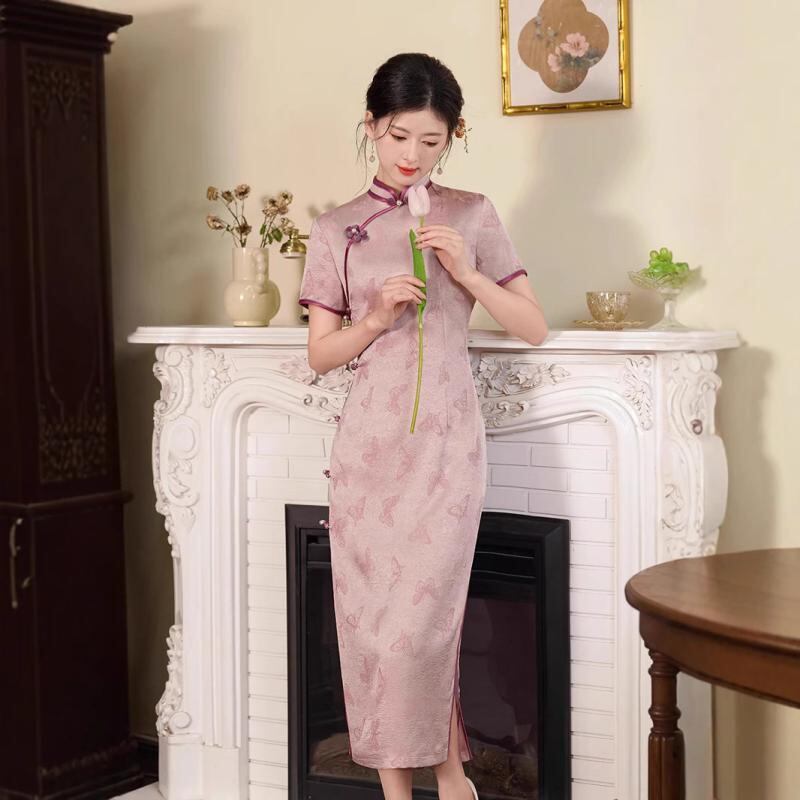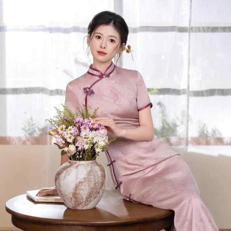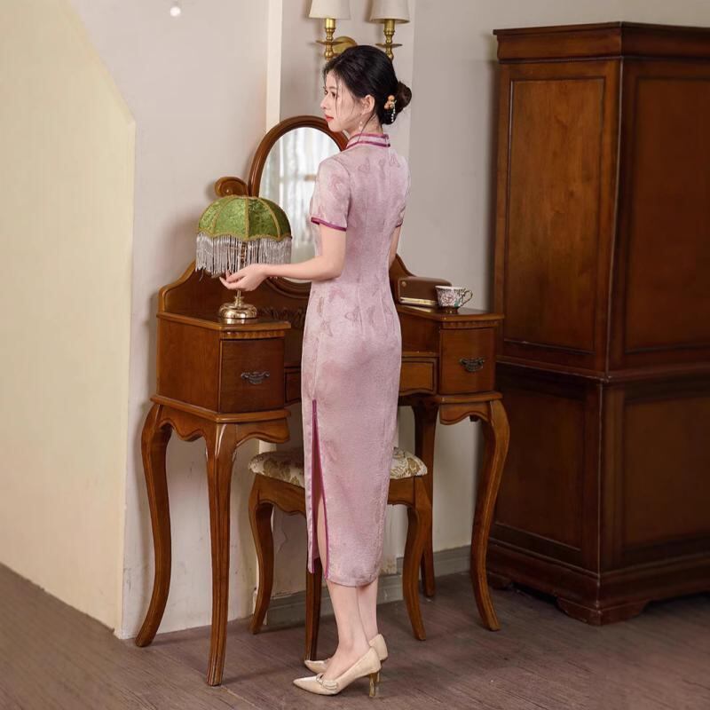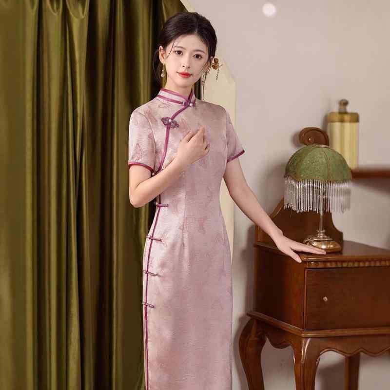 チャイナドレス ピンク レディース 若い女性向け 改良 新中華風 高級感 レトロ 民国スタイル ロング丈 スタンドカラー 半袖 スリット入り 婚約式 結婚式 パーティー お呼ばれ フォーマル ジャカードサテン 春夏
