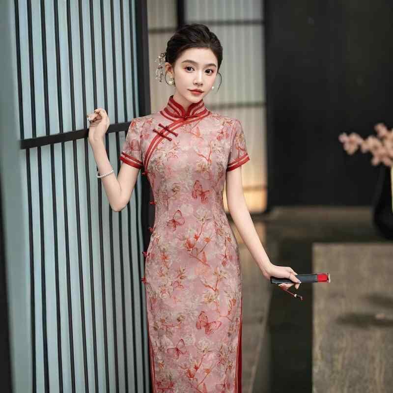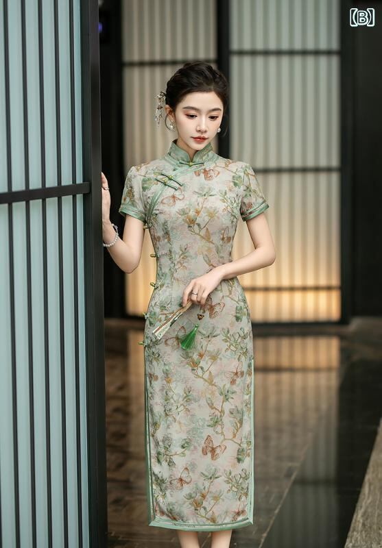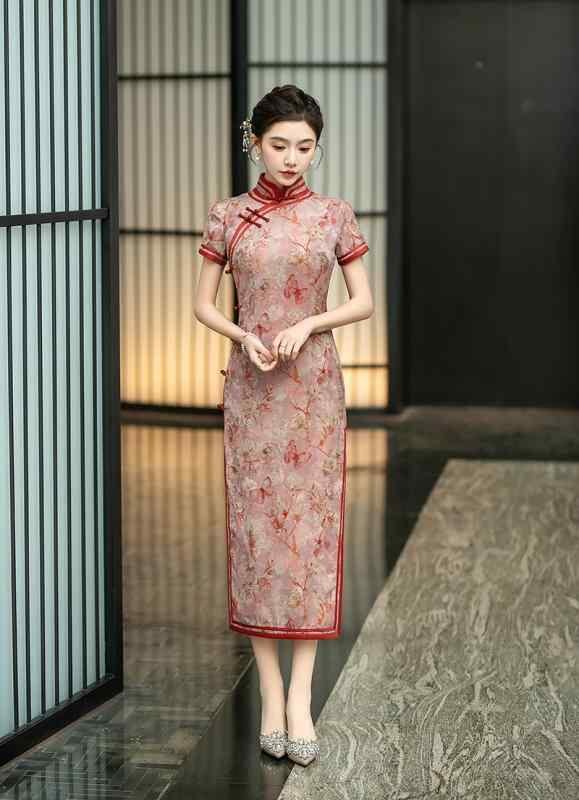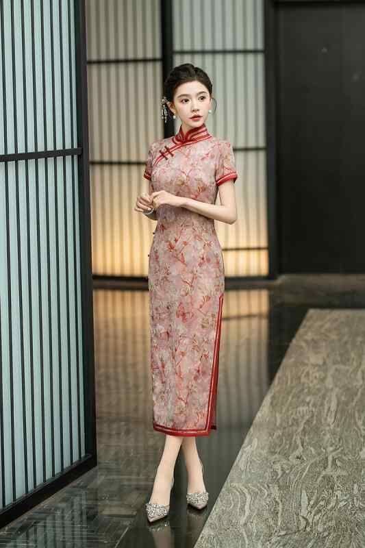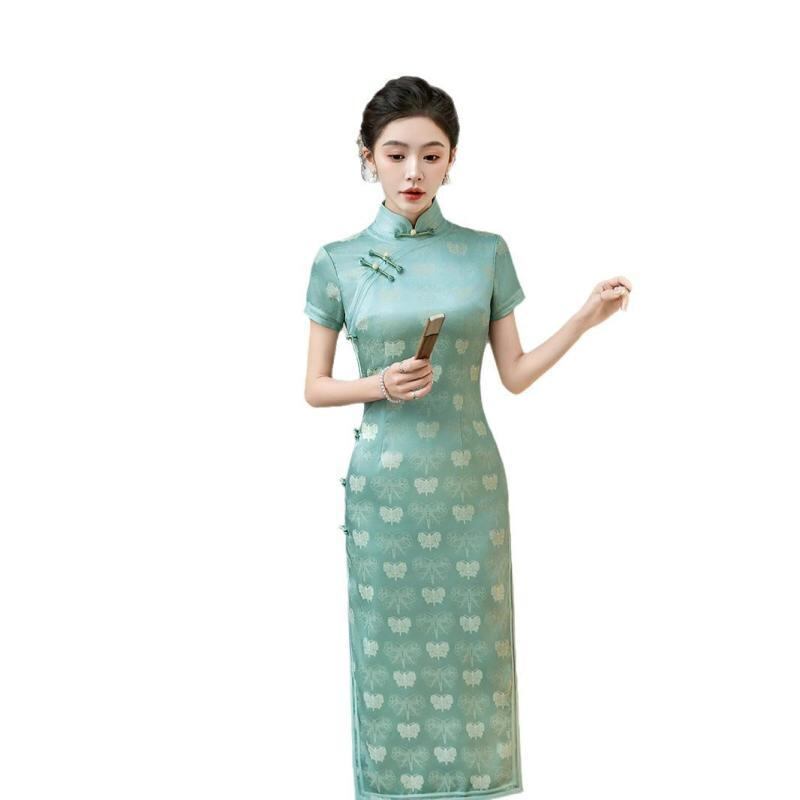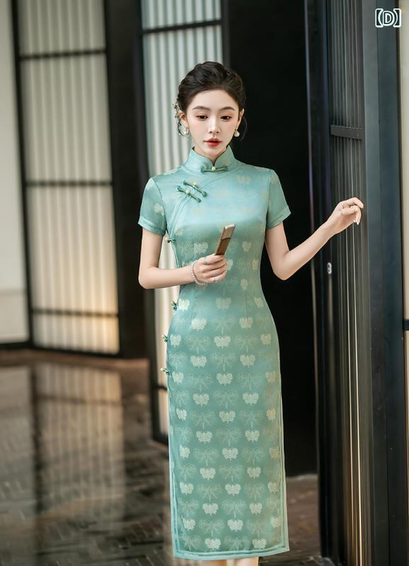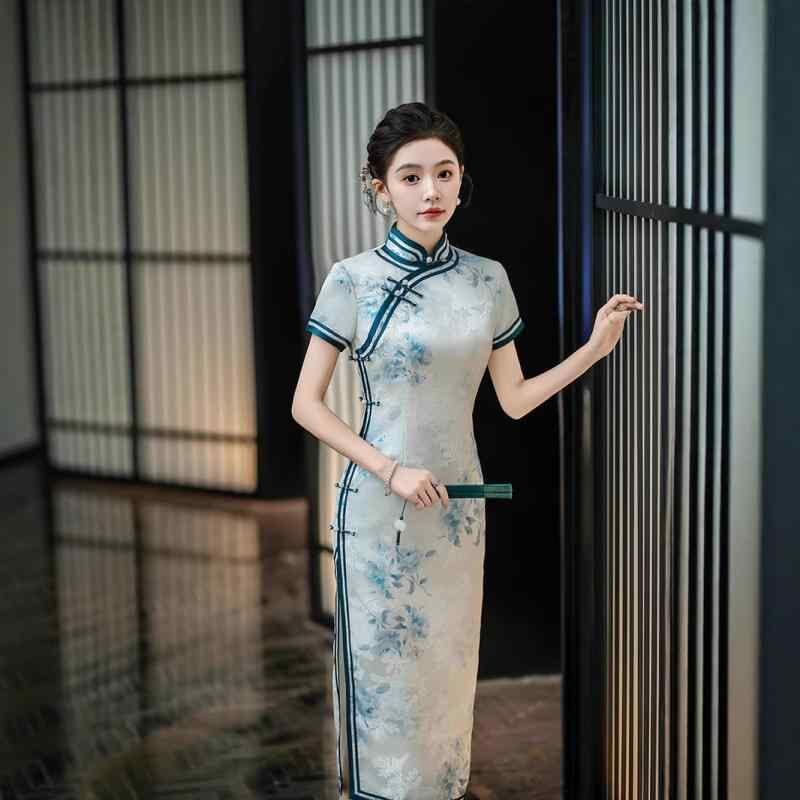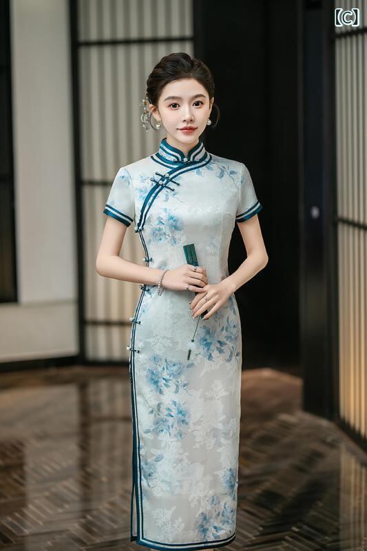 チャイナドレス レディース 春夏 レトロ上海風 エレガント 上品 改良デザイン ロング丈 七分袖 ジャカード織り 花柄 立襟 スリット入り ストレッチ ワンピース
