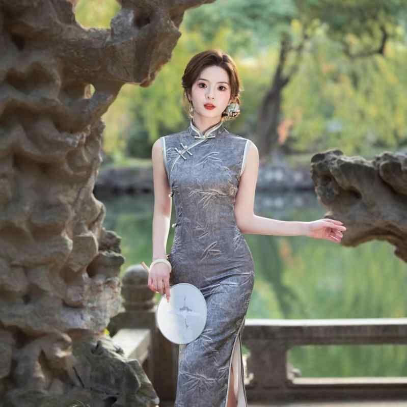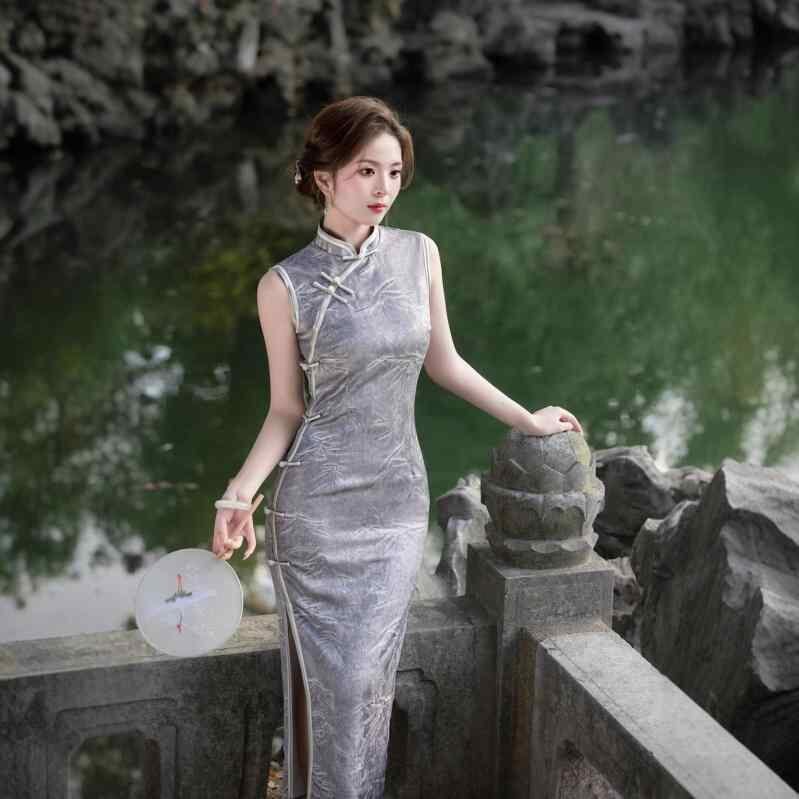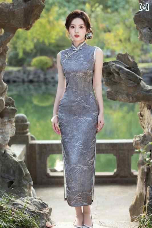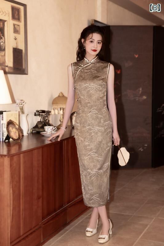 チャイナドレス レディース ネオチャイナ 優美 上品 レトロ 中国風 ロング丈 マキシ丈 ノースリーブ スタンドカラー 斜め襟 サイドスリット 普段使い ジャガードサテン ポリエステル 春夏 グレー ブラウン