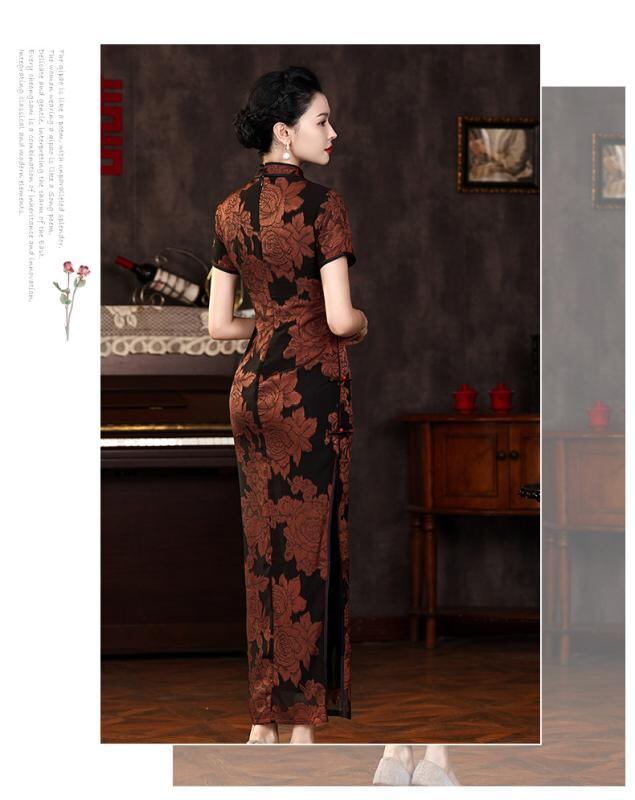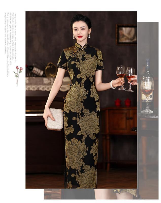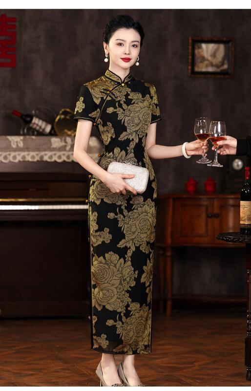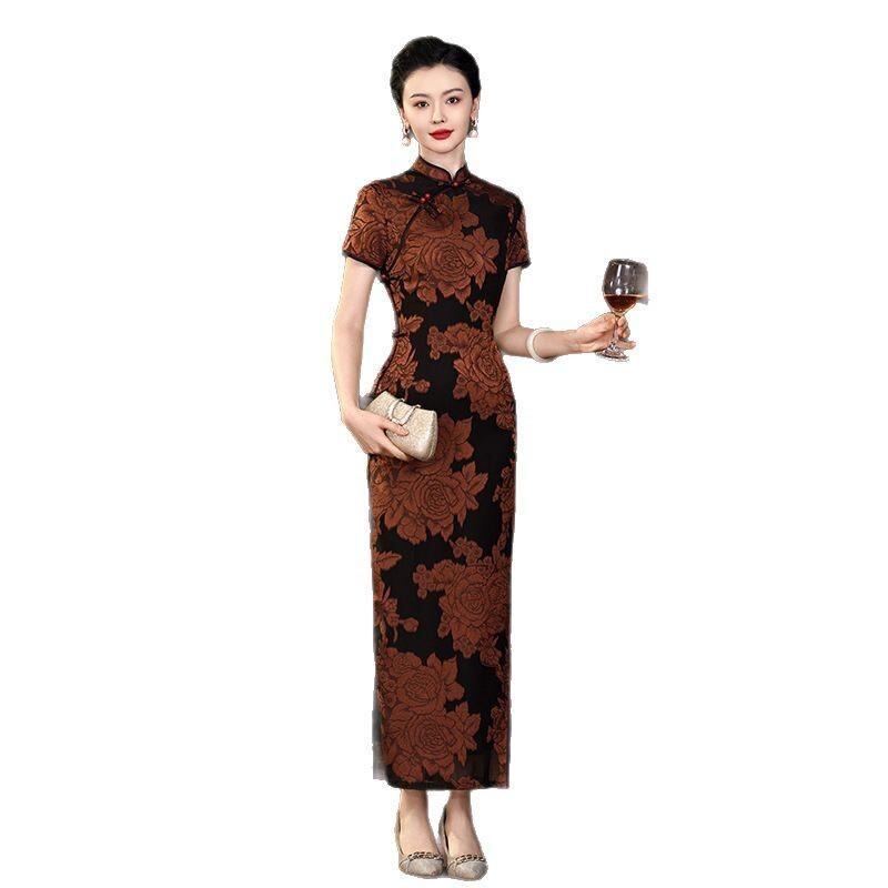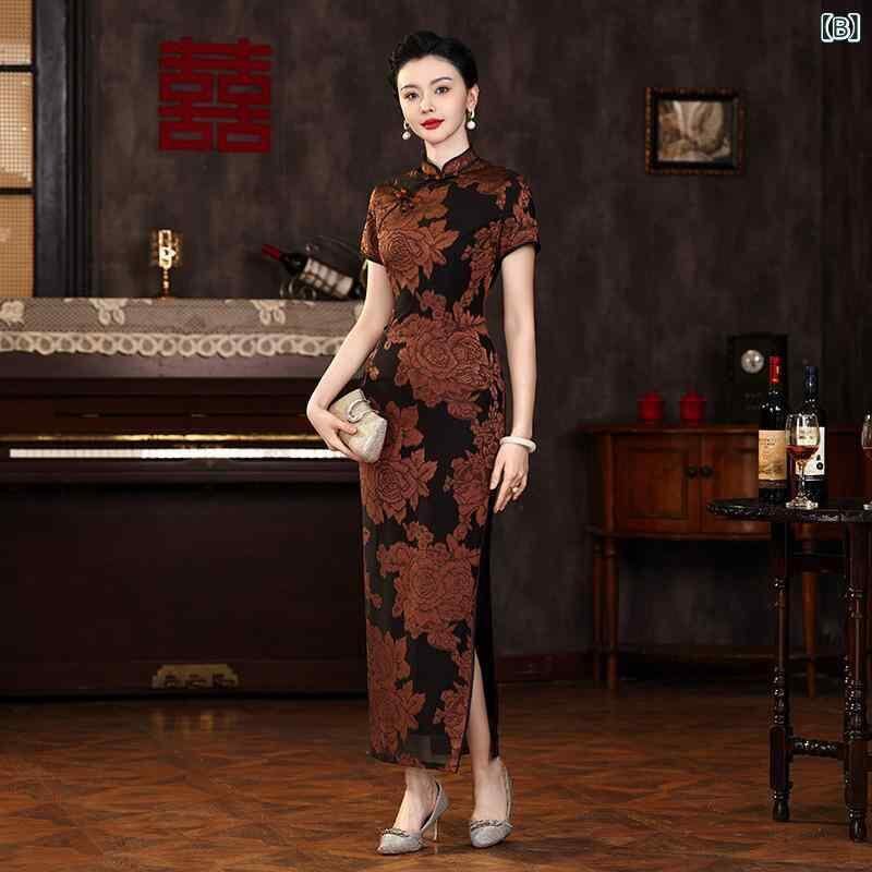 チャイナドレス レディース 上海レトロ 改良 上品 エレガント 普段使い 花柄 ジャカード織り ミドル丈 スタンドカラー 斜め合わせ ラインストーン 春夏 ポリエステル 黄緑 ブラウン きれいめ通勤 ワンピース