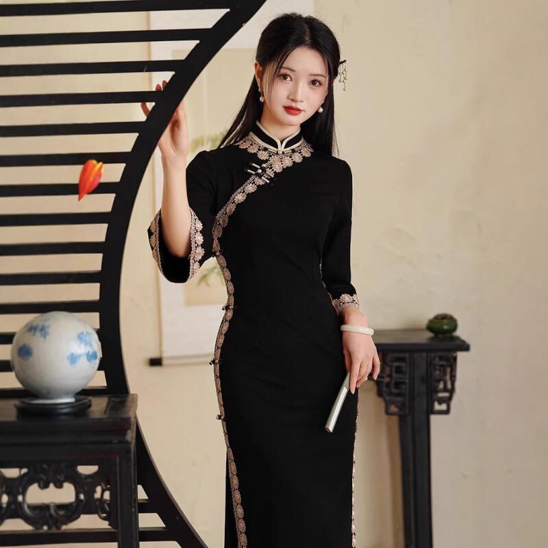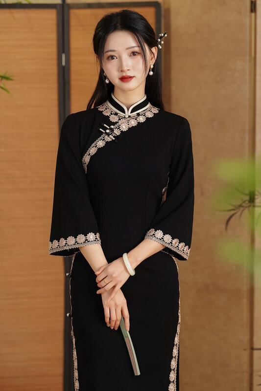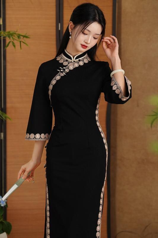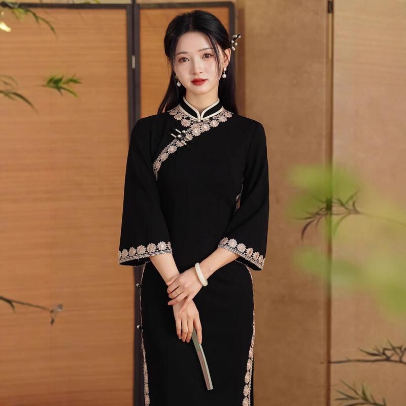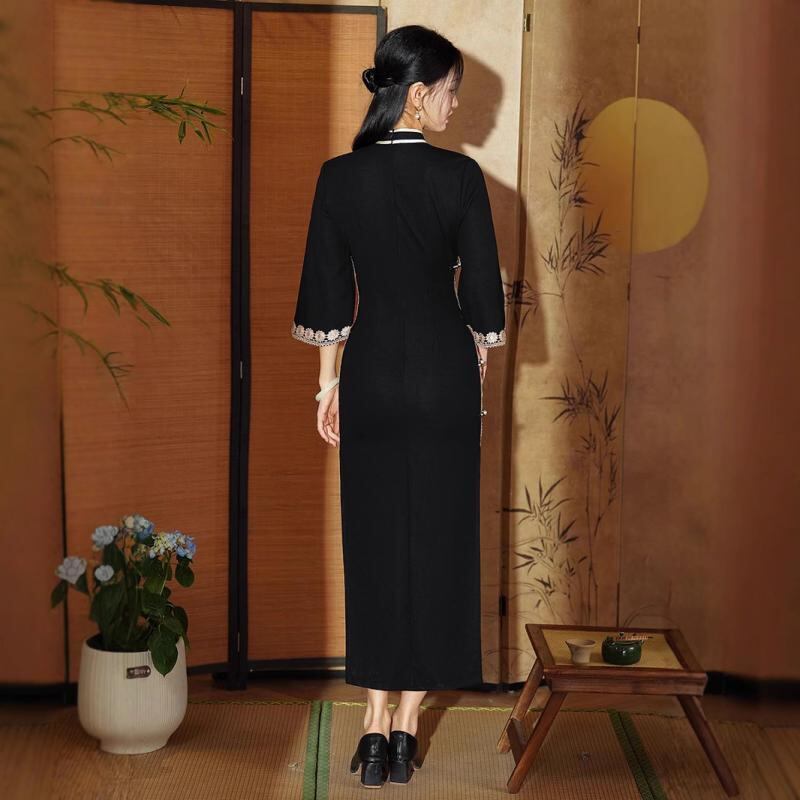 チャイナドレス レディース 女性用 春夏 ローマ綿 ロング丈 スリムフィット 細見え 体型カバー 普段使い フォーマル オケージョン スタンドカラー 七分袖 ブラック