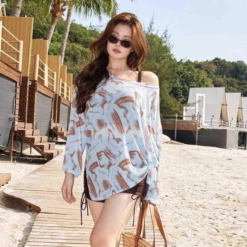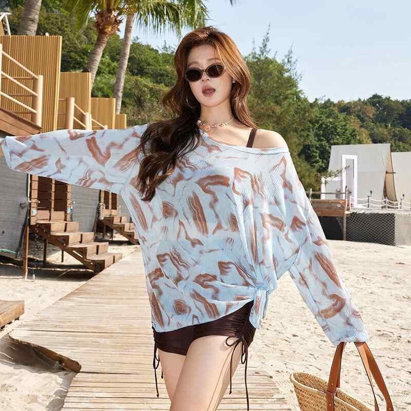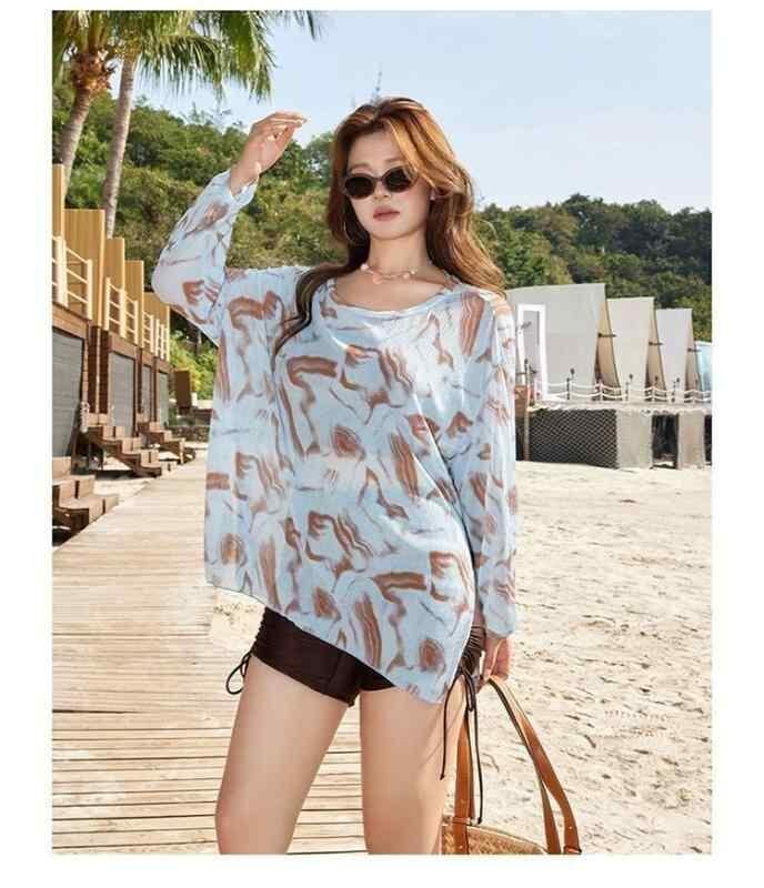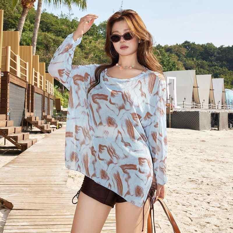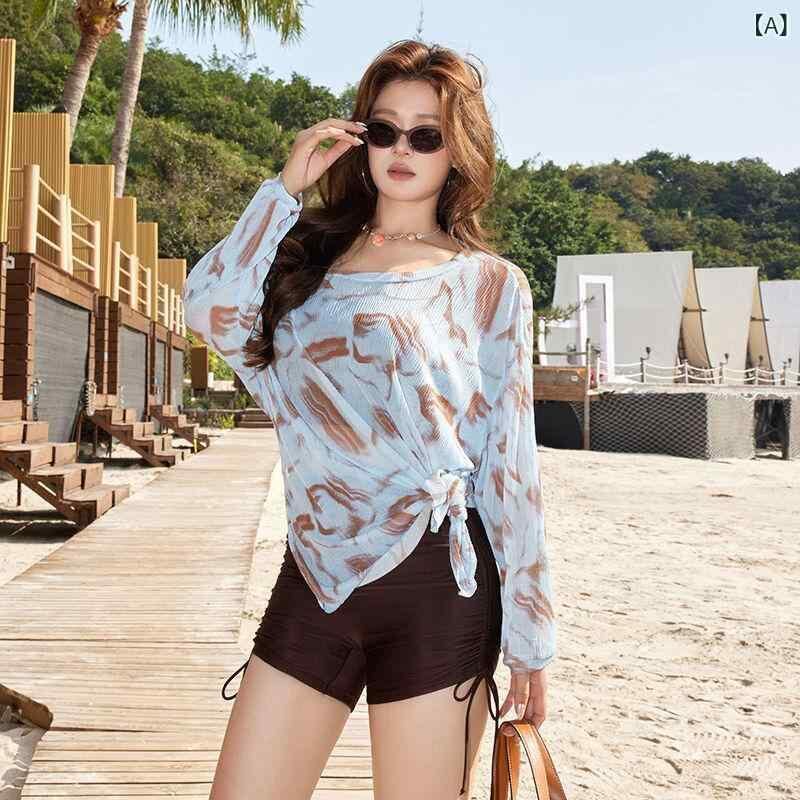 水着 レディース 体型カバー 着痩せ効果 ゆったり セパレート ビキニ 3点セット 大きいサイズ プラスサイズ 長袖 露出控えめ 速乾 耐久性 ポリエステル素材 ハイウエスト パッド付き ノンワイヤー ブラウン 無地 ショートパンツ