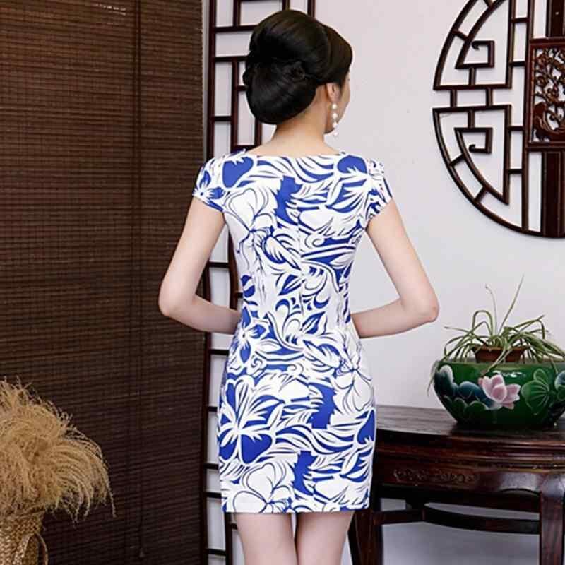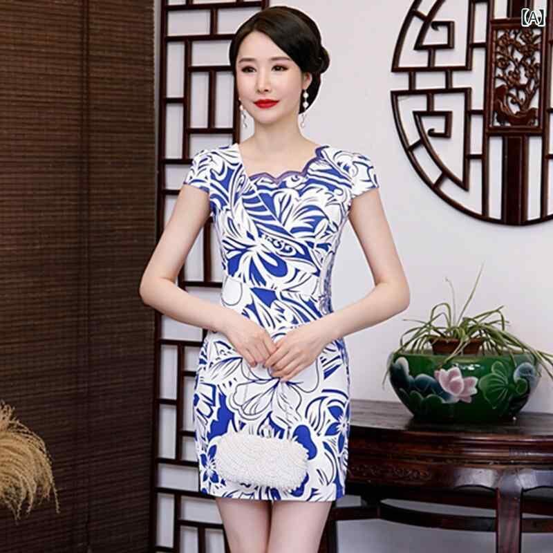 チャイナドレス 女性 ミセス 新チャイナ風 蘇州刺繍 高級感 上品 エレガント ミドル丈 ワンピース 綿 コットン ラウンドネック 3分袖 シアー素材 ブルー 伸縮性 春夏