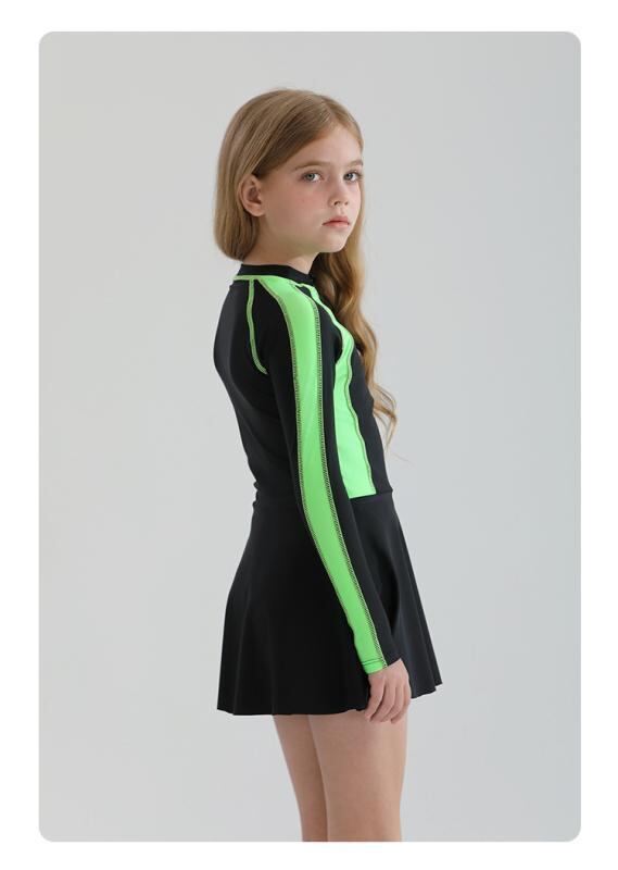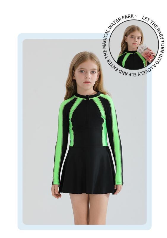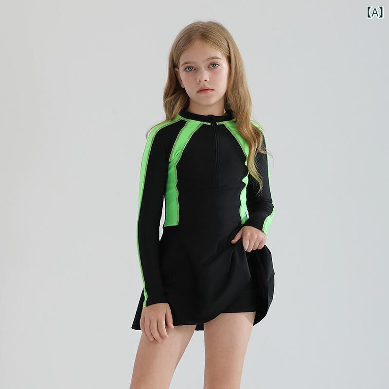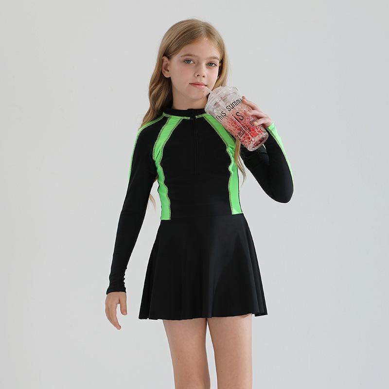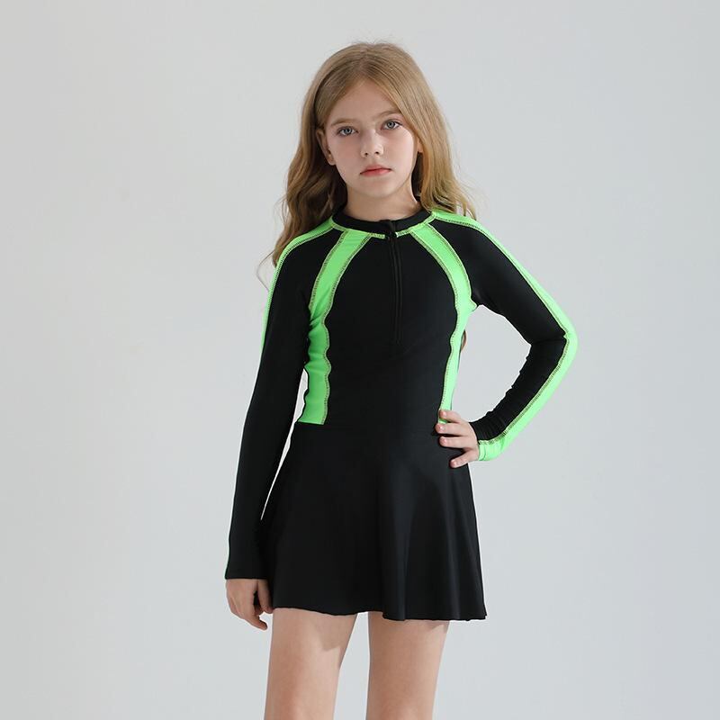 水着 キッズ 女の子 女児 小中学生 ワンピース型 スカート一体型 長袖 日焼け防止 UVカット 体型カバー プール 海 温泉 スイミング ナイロン ポリエステル スイムウェア