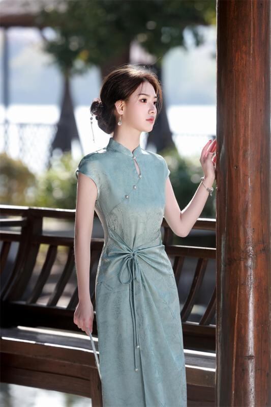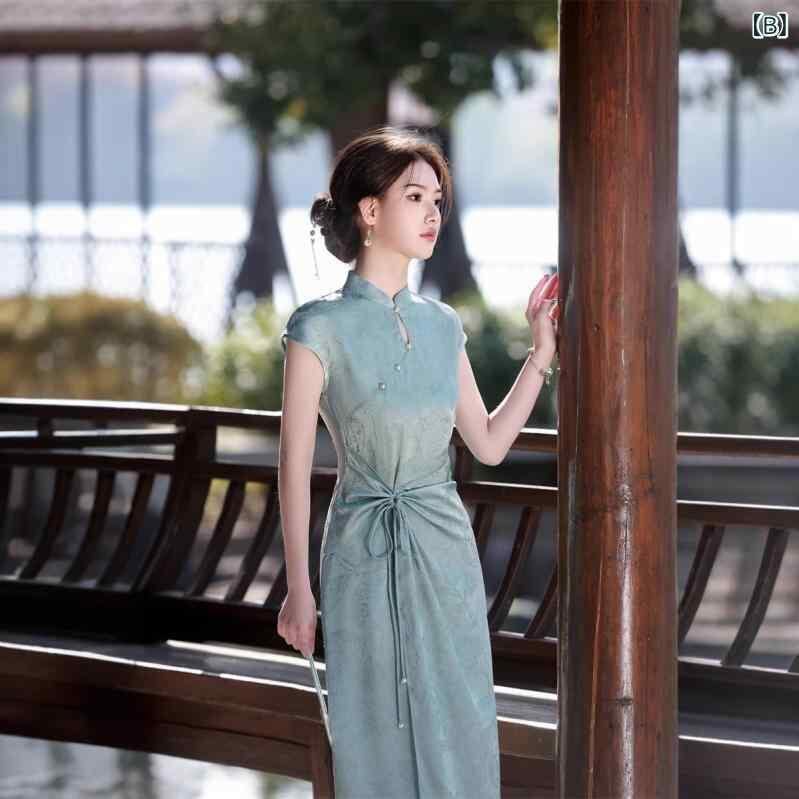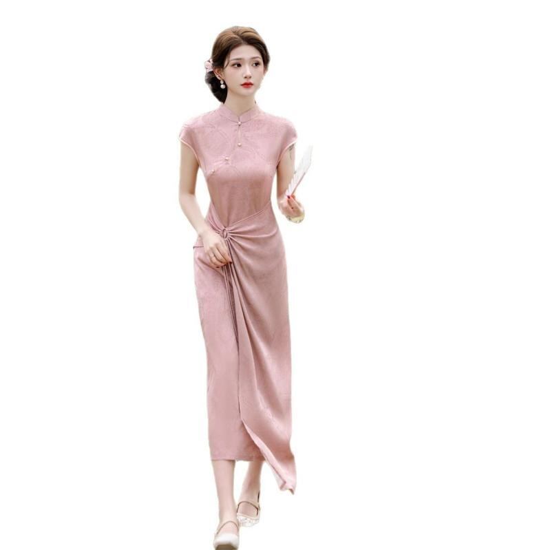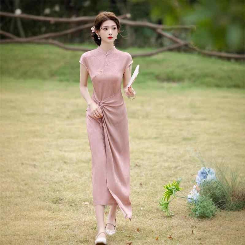 チャイナドレス レディース モダン シンプル 改良 新チャイナスタイル ロング丈 ワンピース 普段使い 体型カバー サテン ジャカード ポリエステル スタンドカラー 斜め襟 半袖 伸縮性 エレガント 3D柄 ピンク系 ライトブルー 春夏