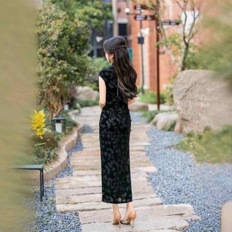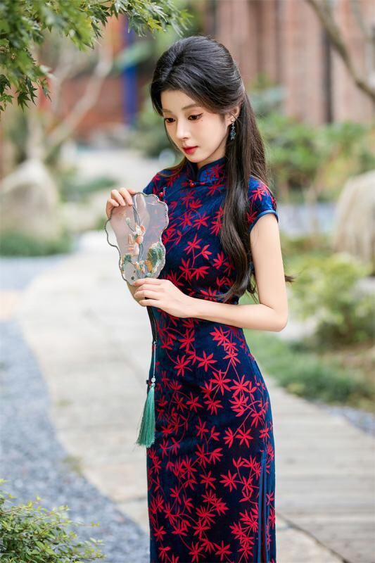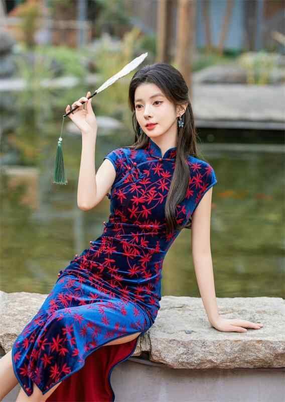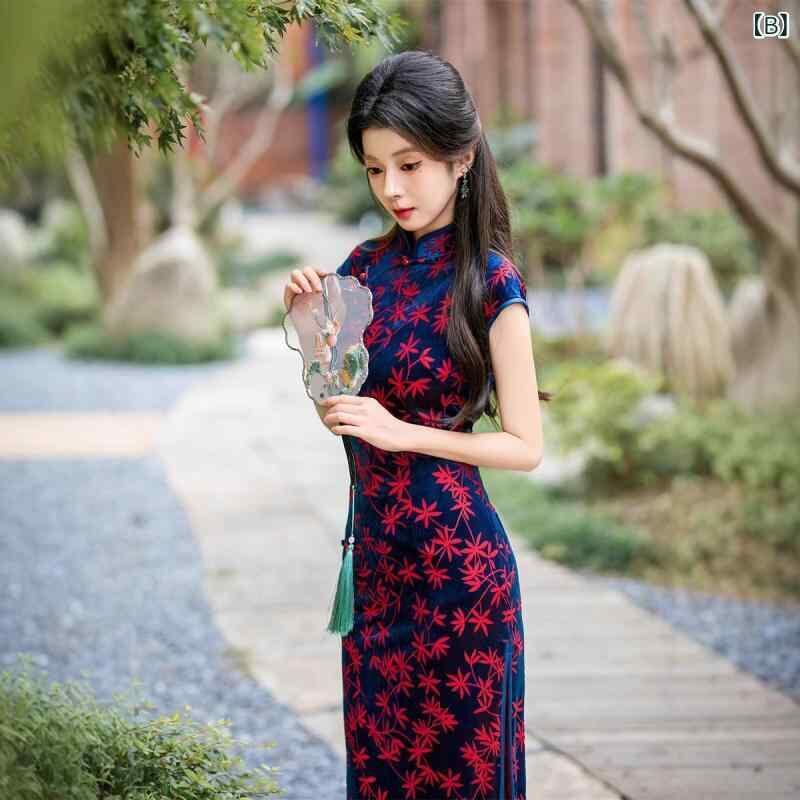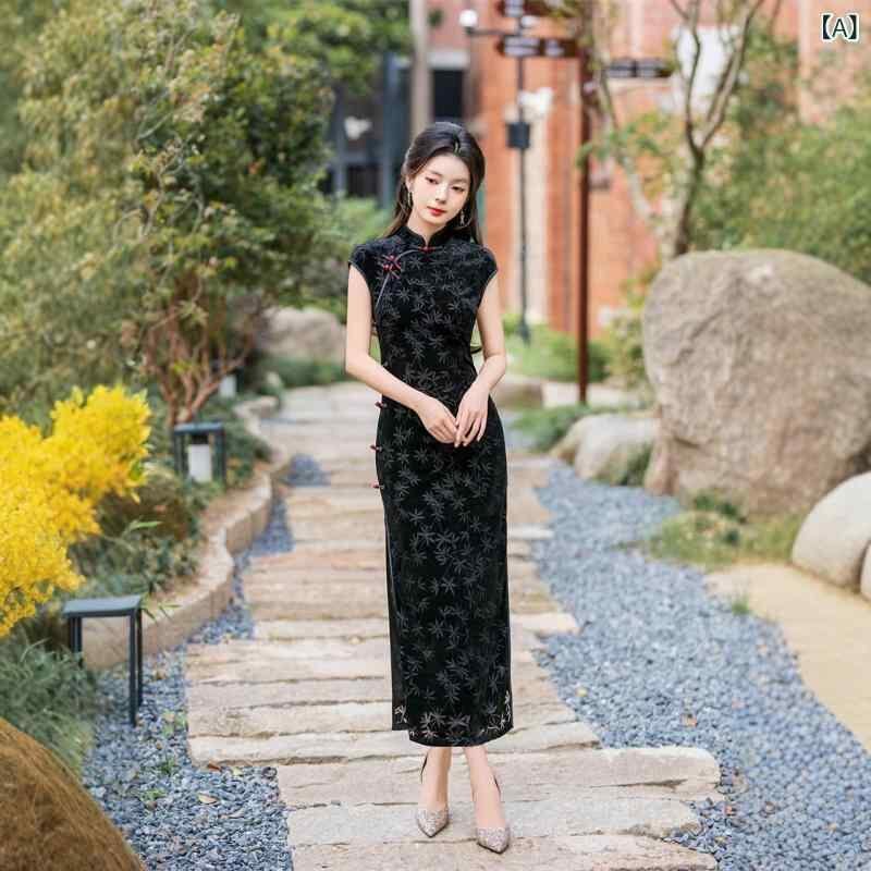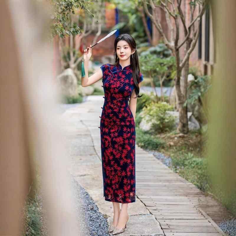 ワンピース レディース 春夏 改良 チャイナドレス レトロ 中華風 ベルベット ロング丈 スタンドカラー 三分袖 スリット 着痩せ パーティードレス エレガント