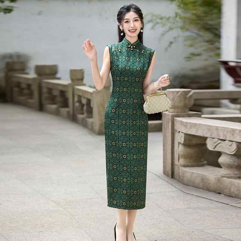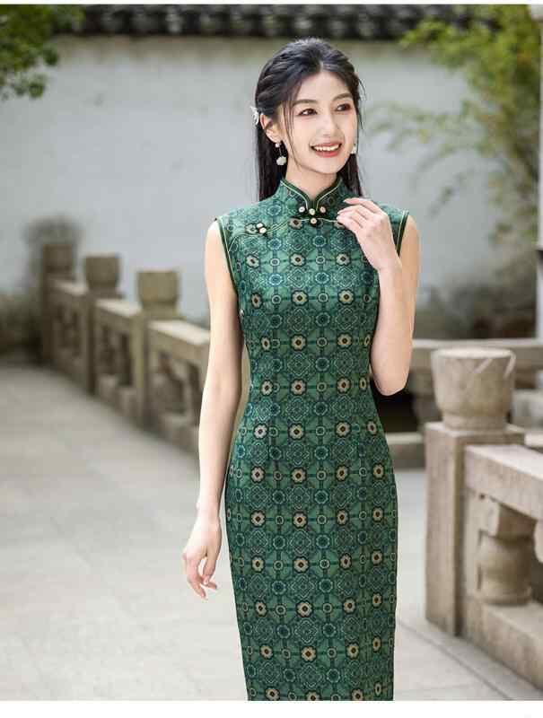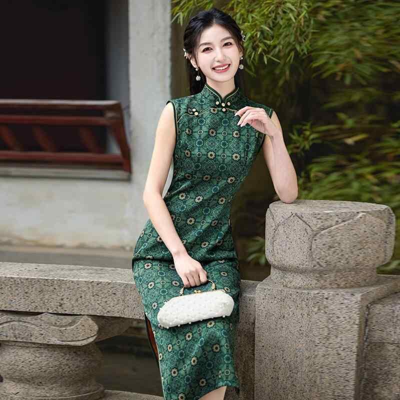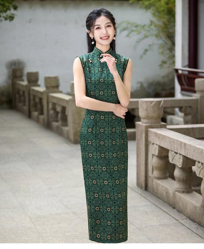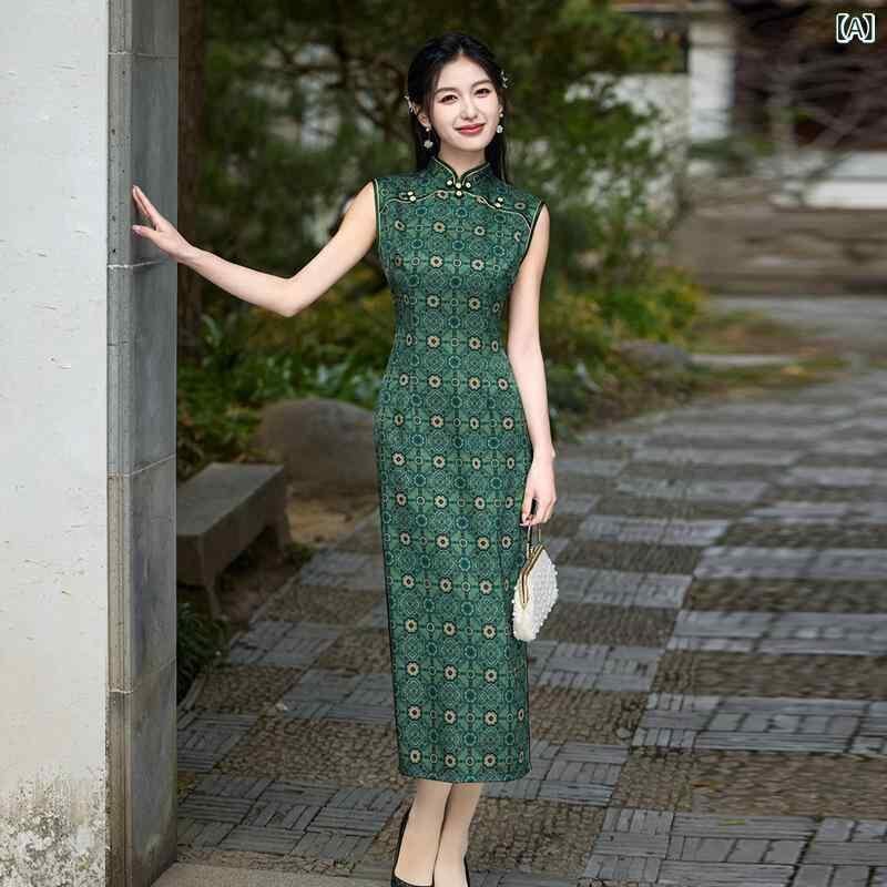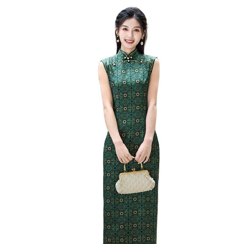 チャイナドレス レディース ワンピース ロング丈 モダンチャイナスタイル レトロ クラシック 上品 エレガント ノースリーブ スタンドカラー 春夏 普段使い グリーン