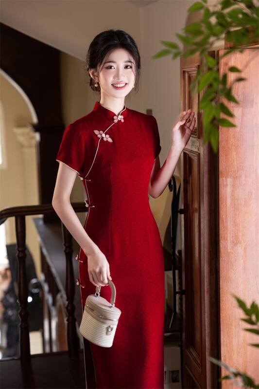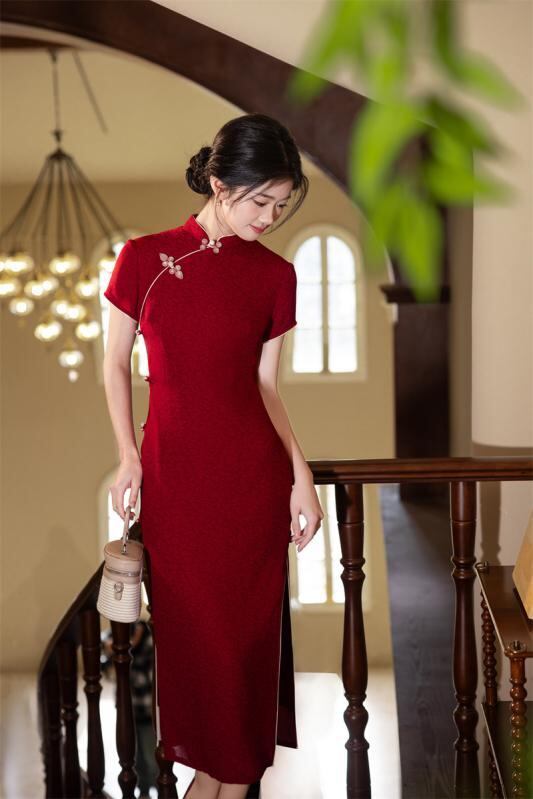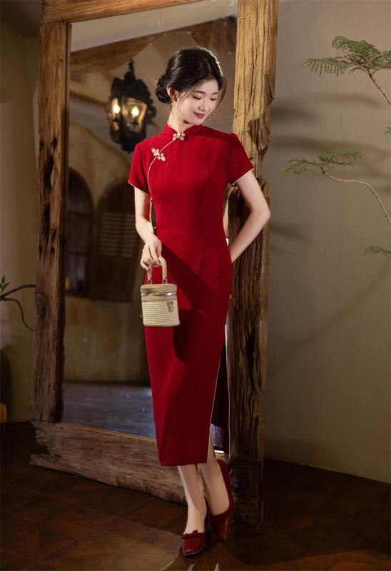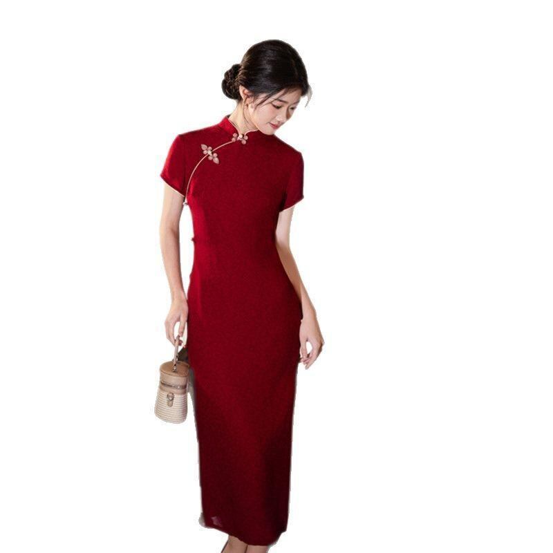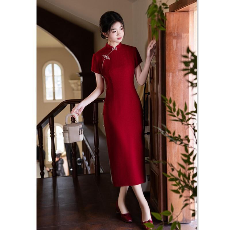 チャイナドレス レディース 母親 フォーマル 結婚式 お呼ばれ パーティー ロング丈 赤色 エレガント レトロモダン ジャカード織り 立体柄 ストレッチ スタンドカラー スリット 春夏