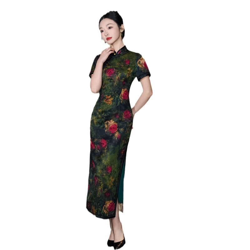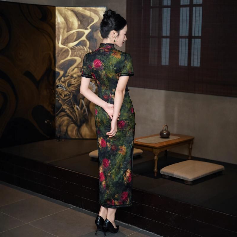 チャイナドレス レディース 春夏 レトロ クラシカル 中国風 オールド上海スタイル ジャカード織り ポリエステル ロング丈 半袖 ハイネック 斜め襟 ダークカラー スリット入り ストレッチ