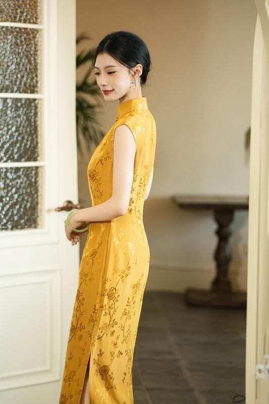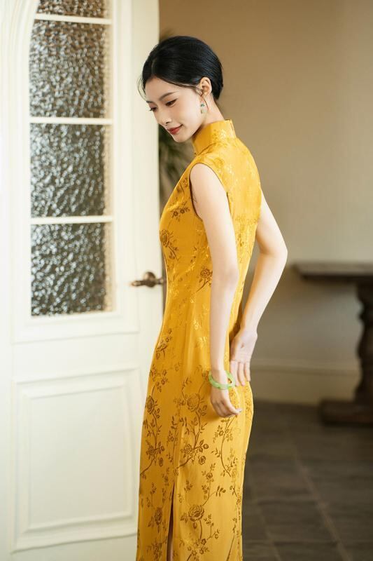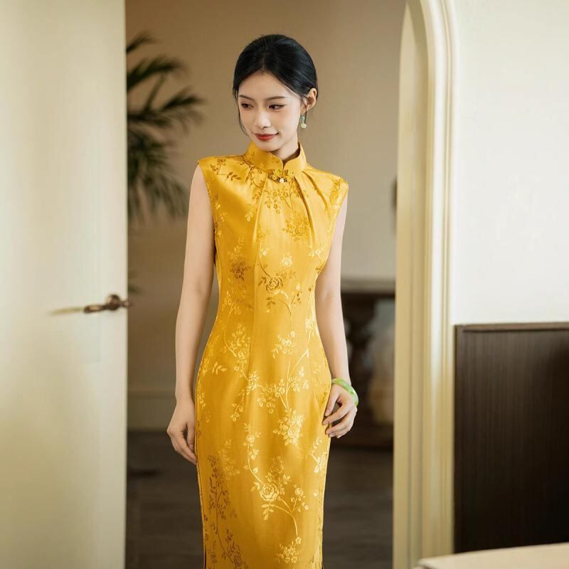 ワンピース レディース 新チャイナ風 改良 チャイナドレス 飾りボタン 半袖 ゴールド 再生繊維 スリット ウエストシェイプ タイト ロング丈 ラウンドネック 春夏 エレガント パーティー お呼ばれ 大人女子