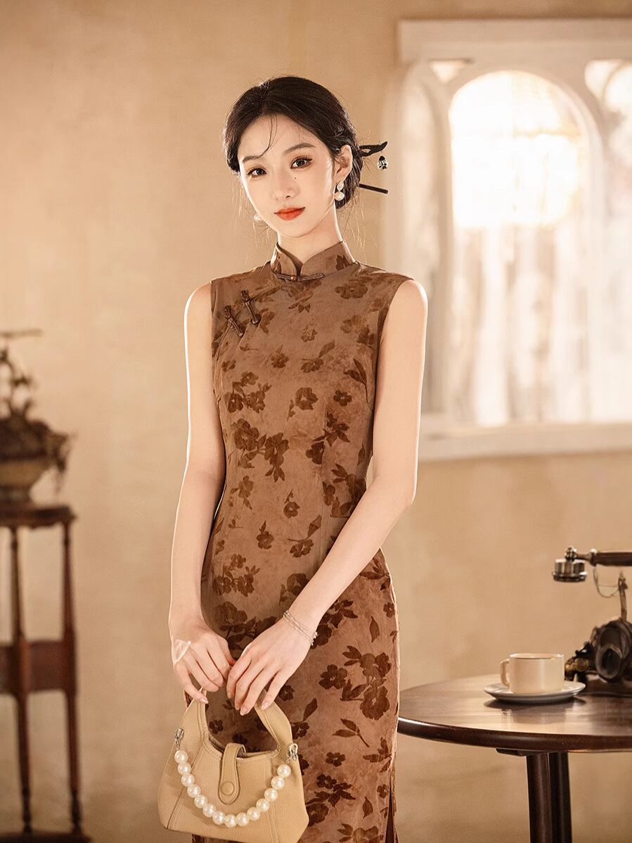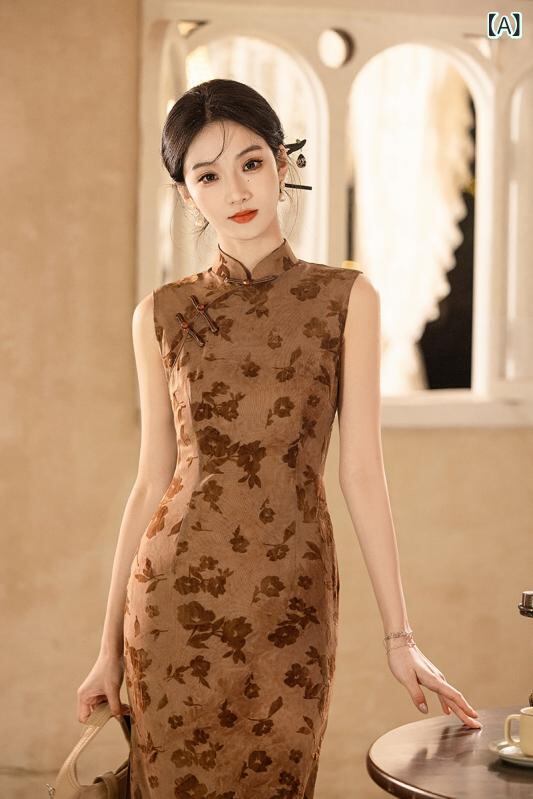 チャイナドレス レディース 新チャイナ風 改良 ノースリーブ ロング丈 スリムフィット 着痩せ効果 普段使い 春夏 ポリエステル 伸縮性 カーキ 若い女性向け