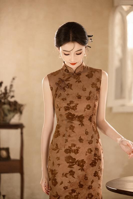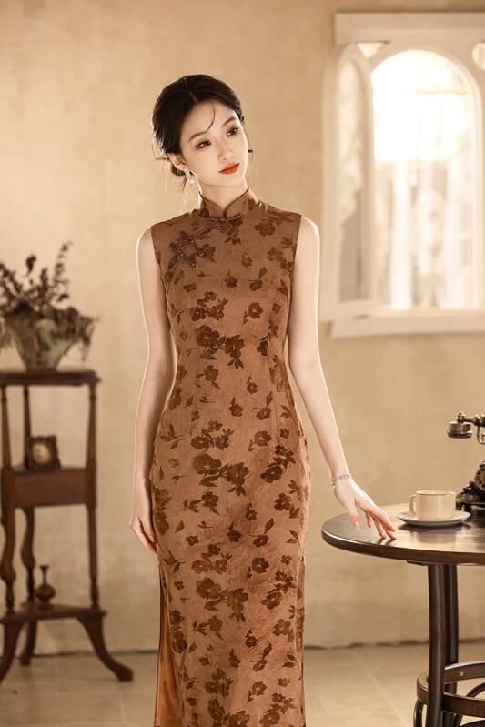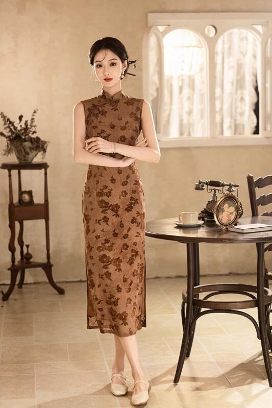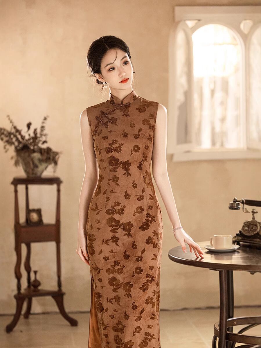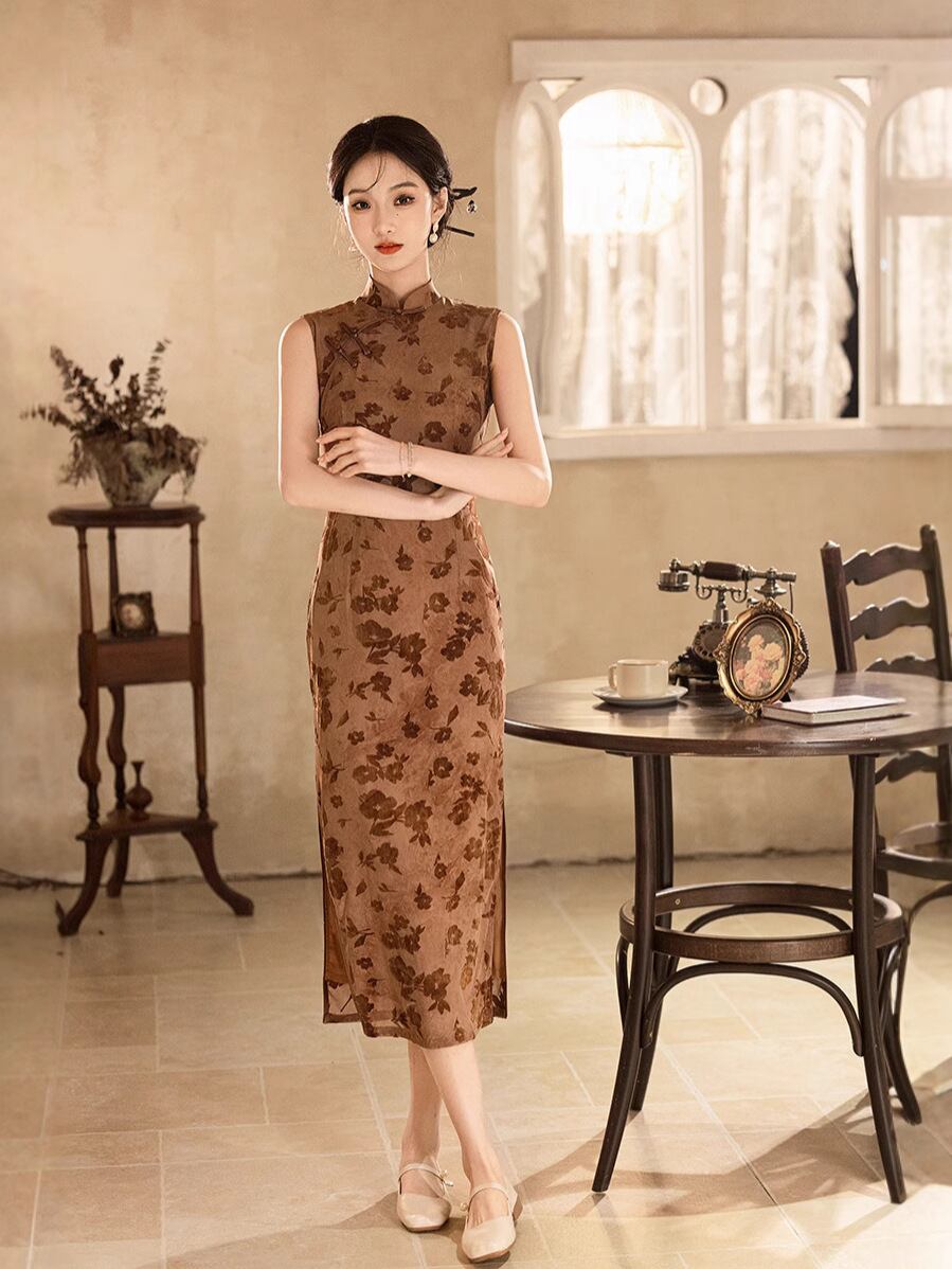 ・生地: チュールフロッキー、・主な素材: ポリエステル約90%、スパンデックス混紡、・丈: ロング、・ネックライン: スタンドカラー、・襟元: 斜め合わせ、・袖丈: ノースリーブ、・スリット: 低め、・デザイン: ファスナー、・カラー: アースイエロー、・サイズ展開: S、M、L、XL、2XL、3XL、・チャイナドレスタイプ: シングル、・スタイル: 文芸レトロ、・対象: 大人、・伸縮性: 若干あり、・対象性別: 女性、・加工: ノーアイロン
