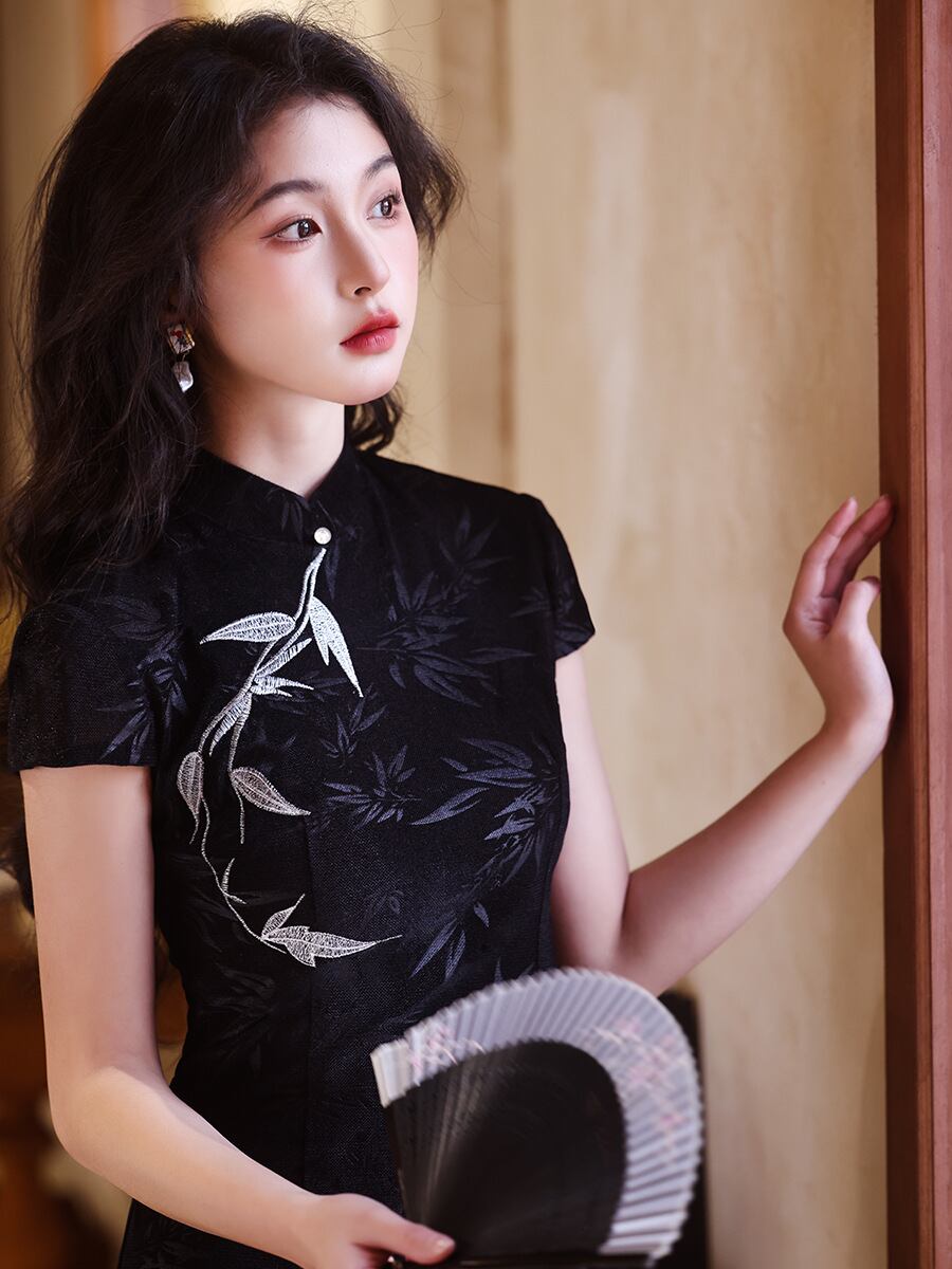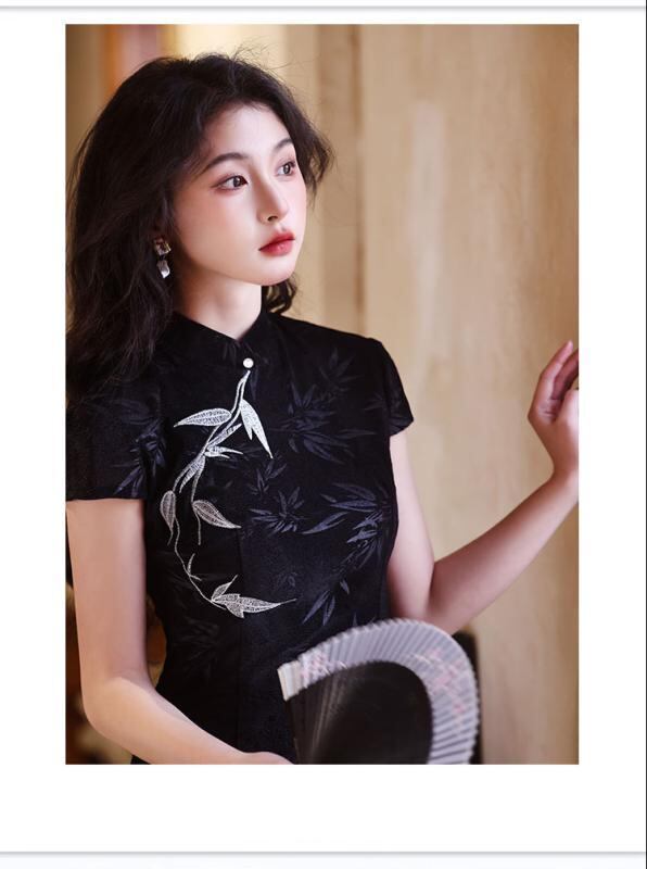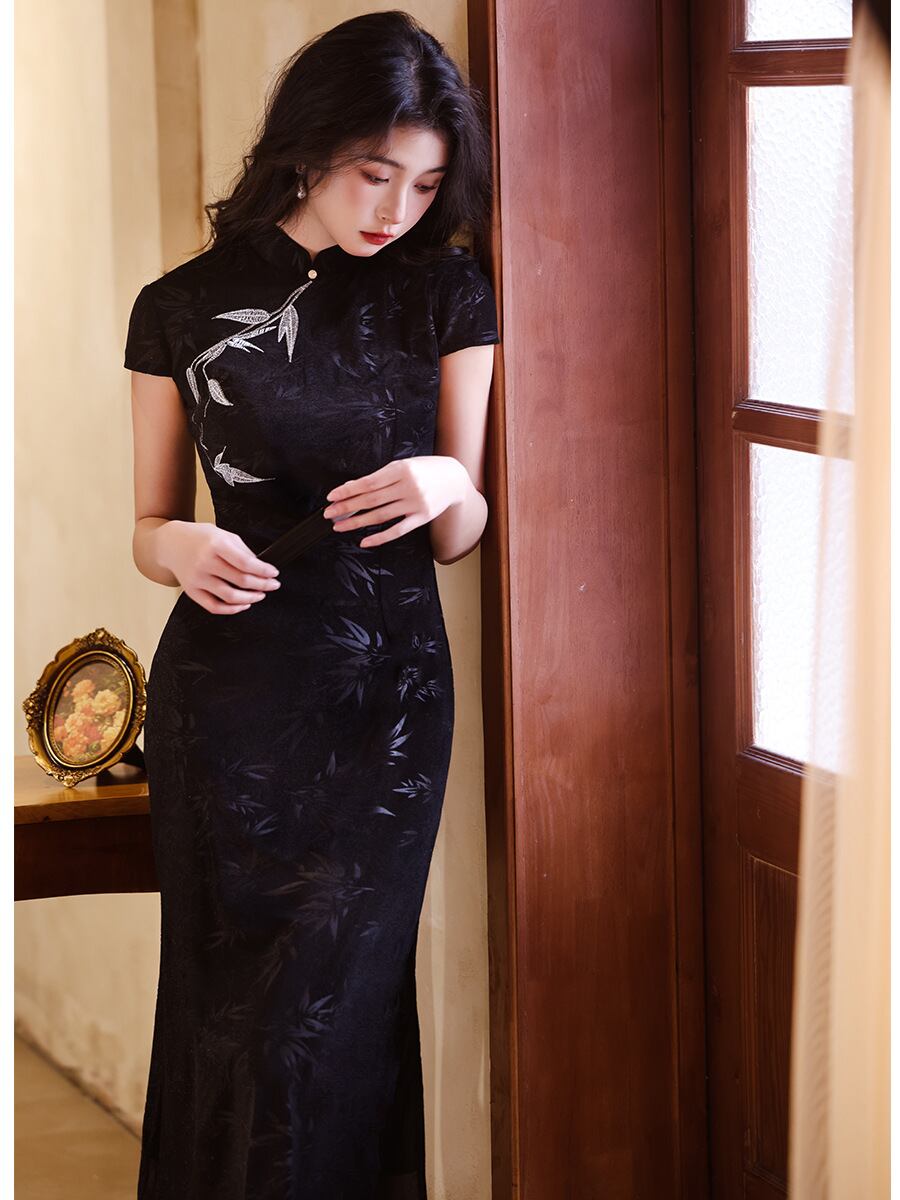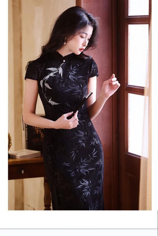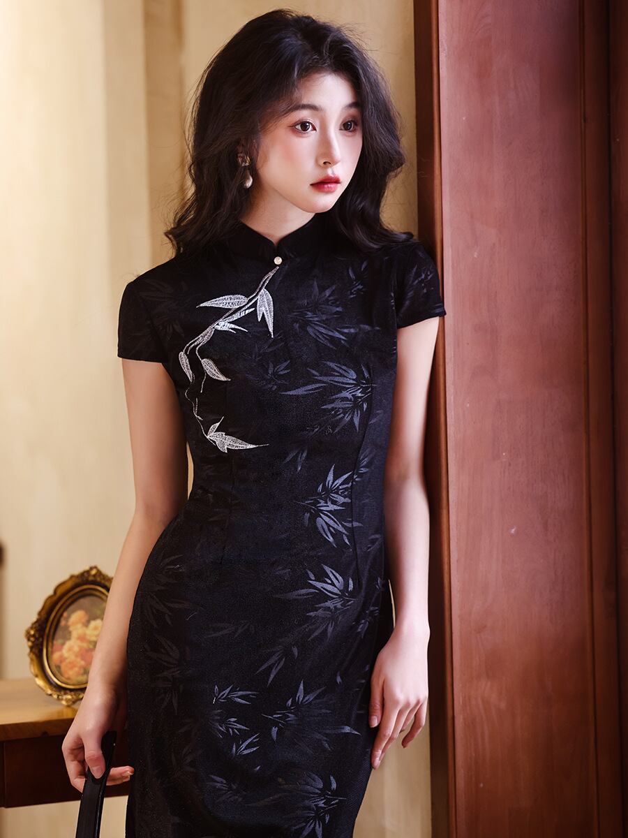 チャイナドレス レディース レトロ民国風 ブラック 新中式 改良 エレガント 高級感 ベルベット ロング丈 スタンドカラー 斜め襟 半袖 ハイサイドスリット 春夏 フォーマル パーティー