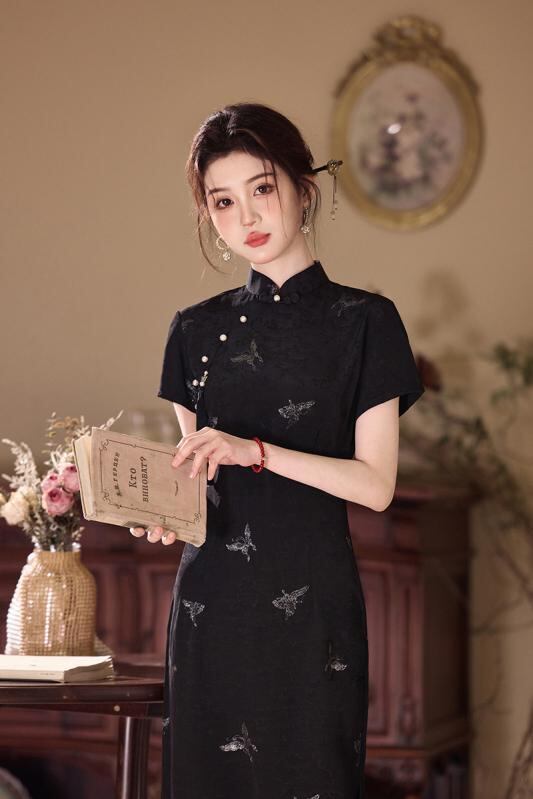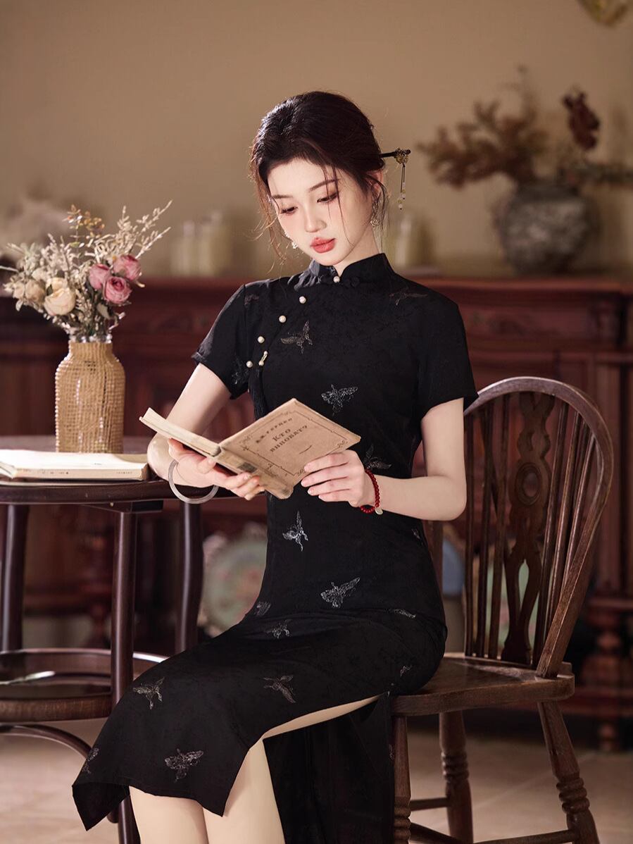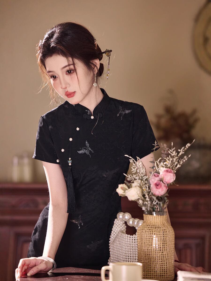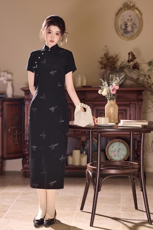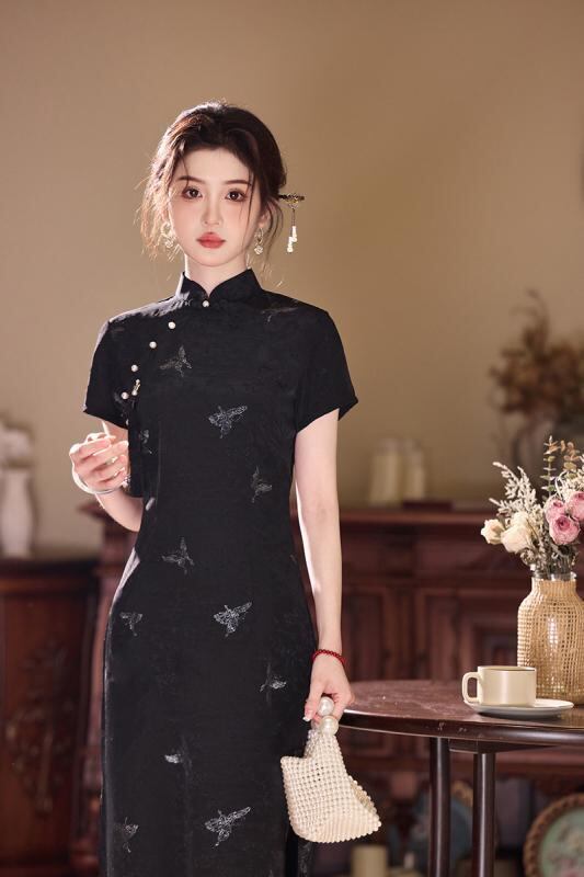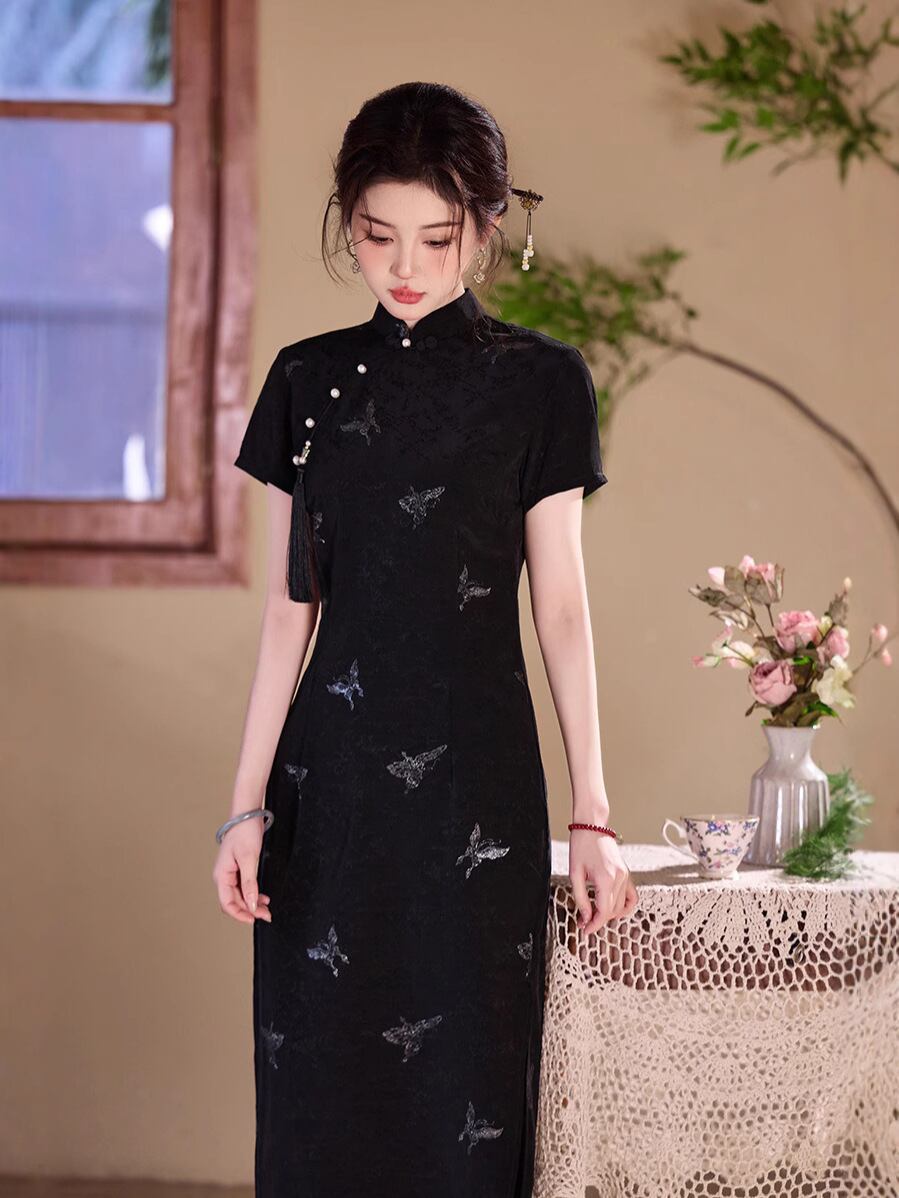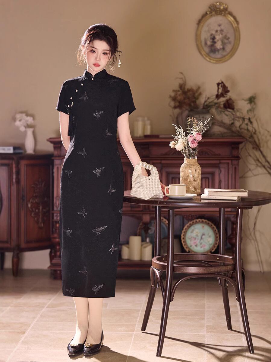 ワンピース レディース 新中国風 改良型 ミディ丈 チャイナドレス ジャカード 蝶柄 箔押し 春夏 スタンドカラー 斜め襟 半袖 ブラック レトロ エレガント 大人向け