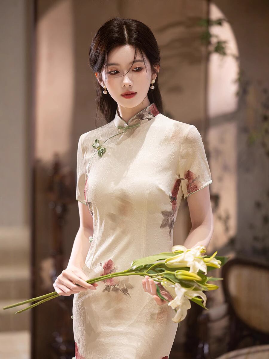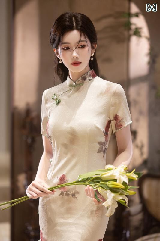 チャイナドレス レディース 新チャイナ風 ワンピース スタンドカラー 七分袖 ロングスリット ミモレ丈 レトロ エレガント ジャカード織り シャンパンカラー 春夏 伸縮性 結婚式 婚約パーティー お呼ばれ フォーマル 通勤 オフィス 普段使い 女性用