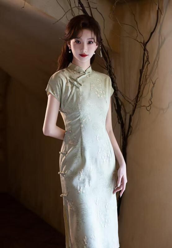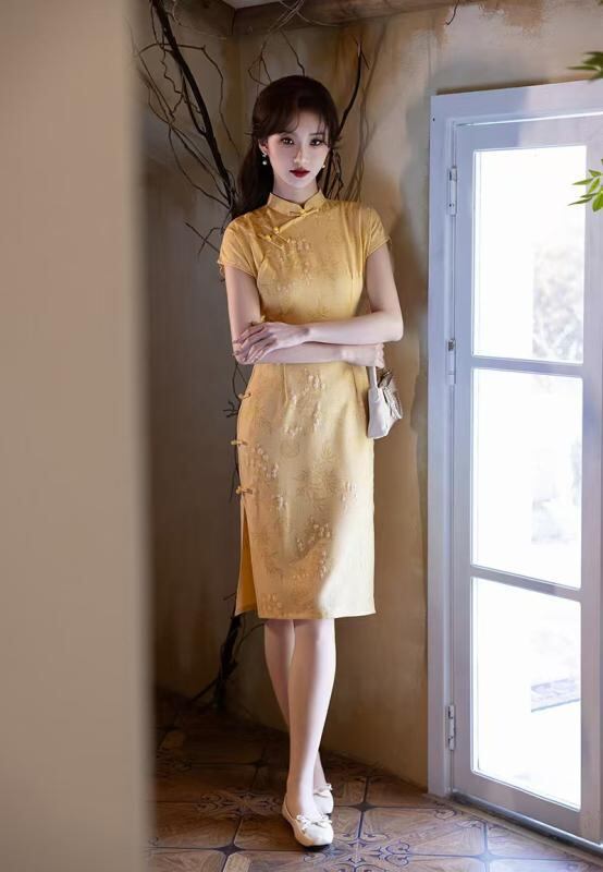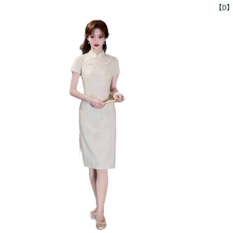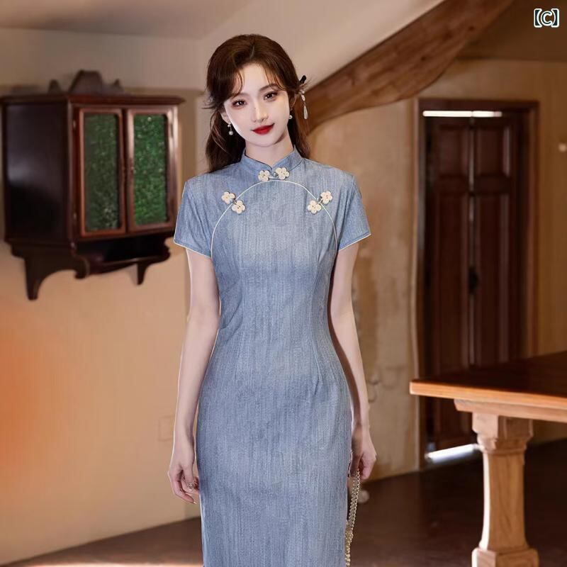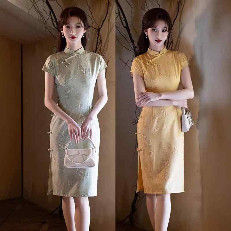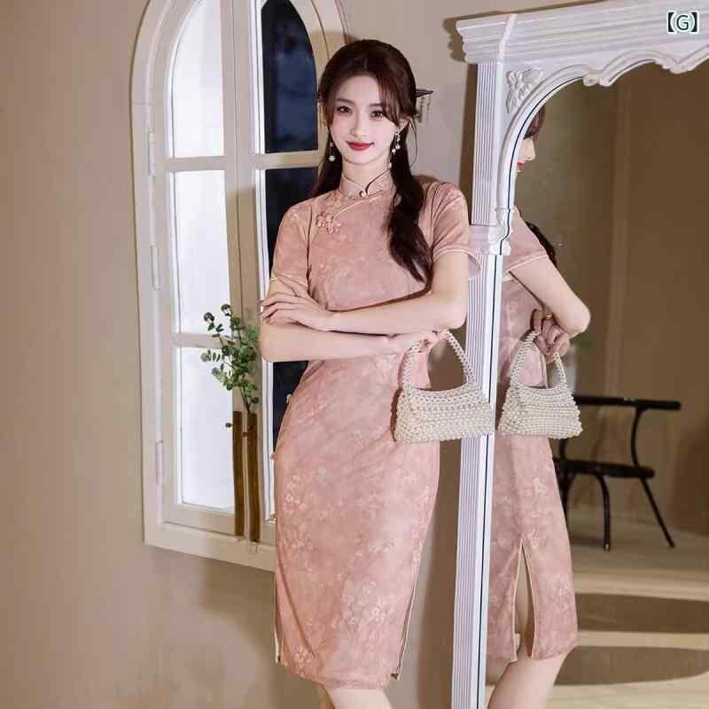 チャイナドレス レディース 上品 かわいい エレガント モダン 高級感 シュニール織 ポリエステル 春夏 ミディ丈 フレア スタンドカラー 七分袖 ワンピース 普段使い お出かけ