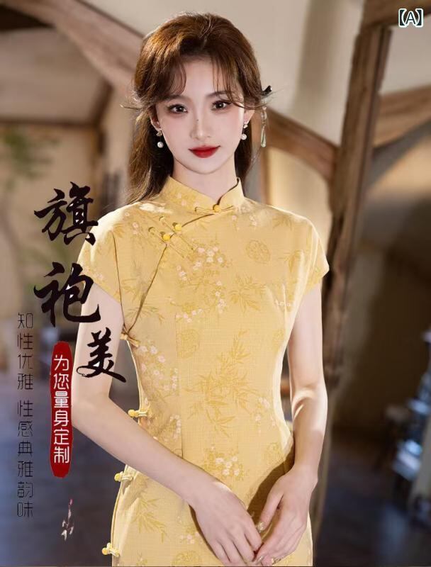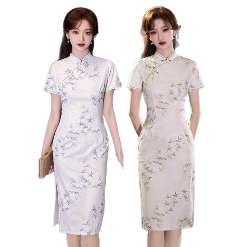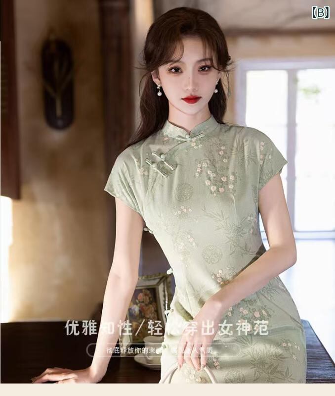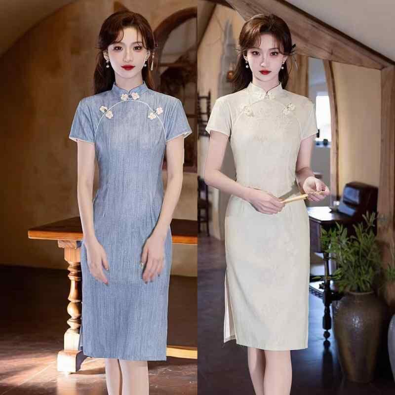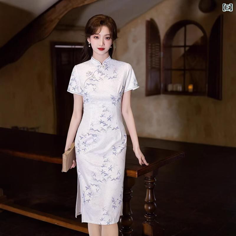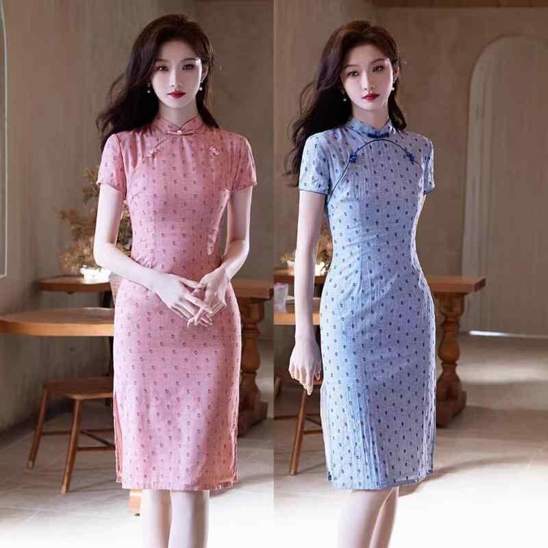 チャイナドレス レディース 上品 かわいい エレガント モダン 高級感 シュニール織 ポリエステル 春夏 ミディ丈 フレア スタンドカラー 七分袖 ワンピース 普段使い お出かけ