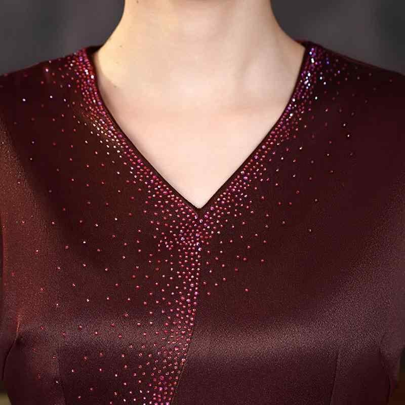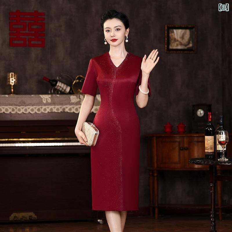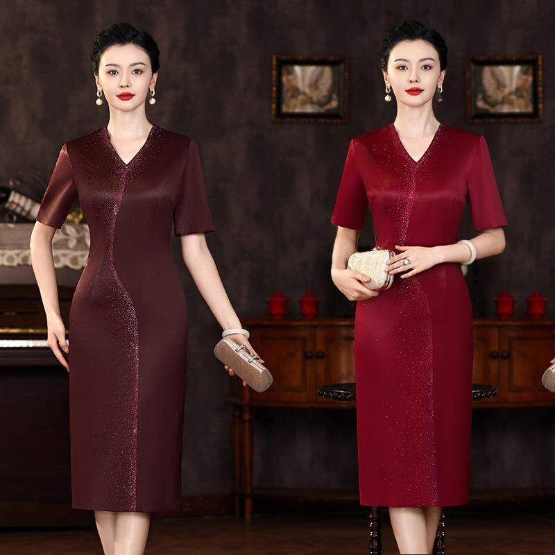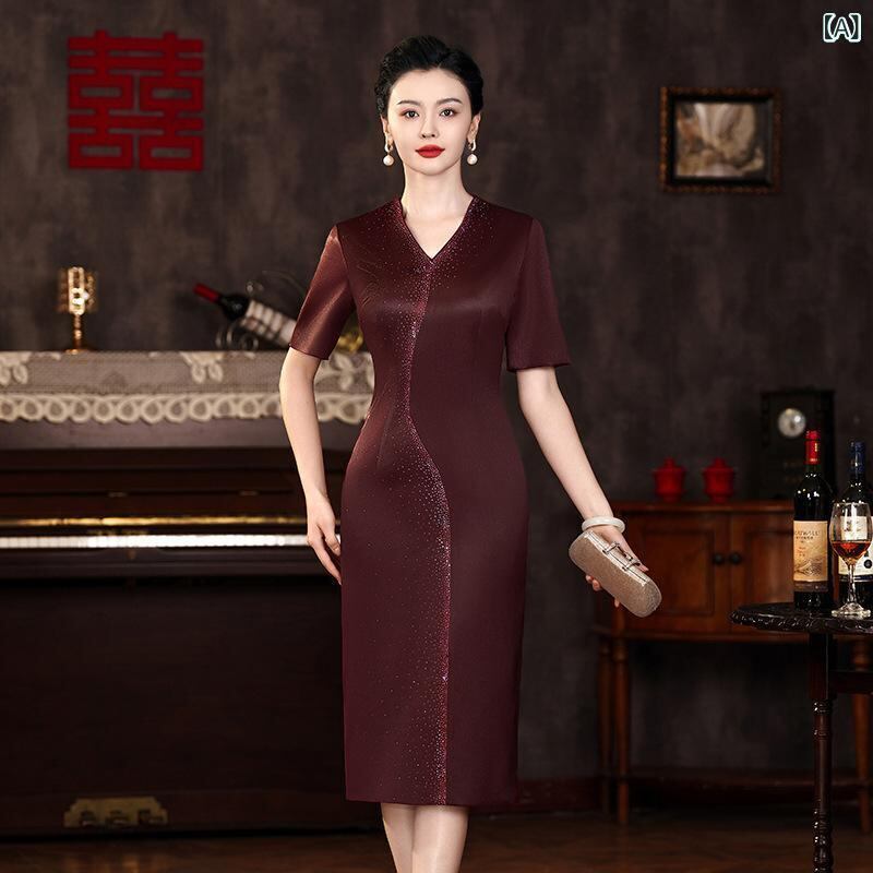 チャイナドレス 女性用 ママ向け 春夏 アセテート ストレッチサテン スパンコール装飾 スタイルアップ 細見え 普段使い デイリー フォーマル パーティー ロング丈 Vネック 半袖 スリット入り